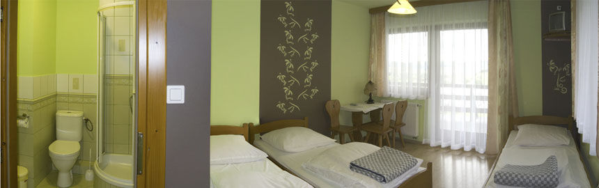 Oferujemy Państwu wypoczynek w miłej rodzinnej atmosferze oraz doskonałą kuchnię. Do Państwa dyspozycji oddajemy nowocześnie urządzone pokoje 2, 3 i 4 osobowe z łazienkami i TV. Obok domu znajduje się duży parking, miejsce na grilla, możliwość zorganizowania kuligów z ogniskiem.