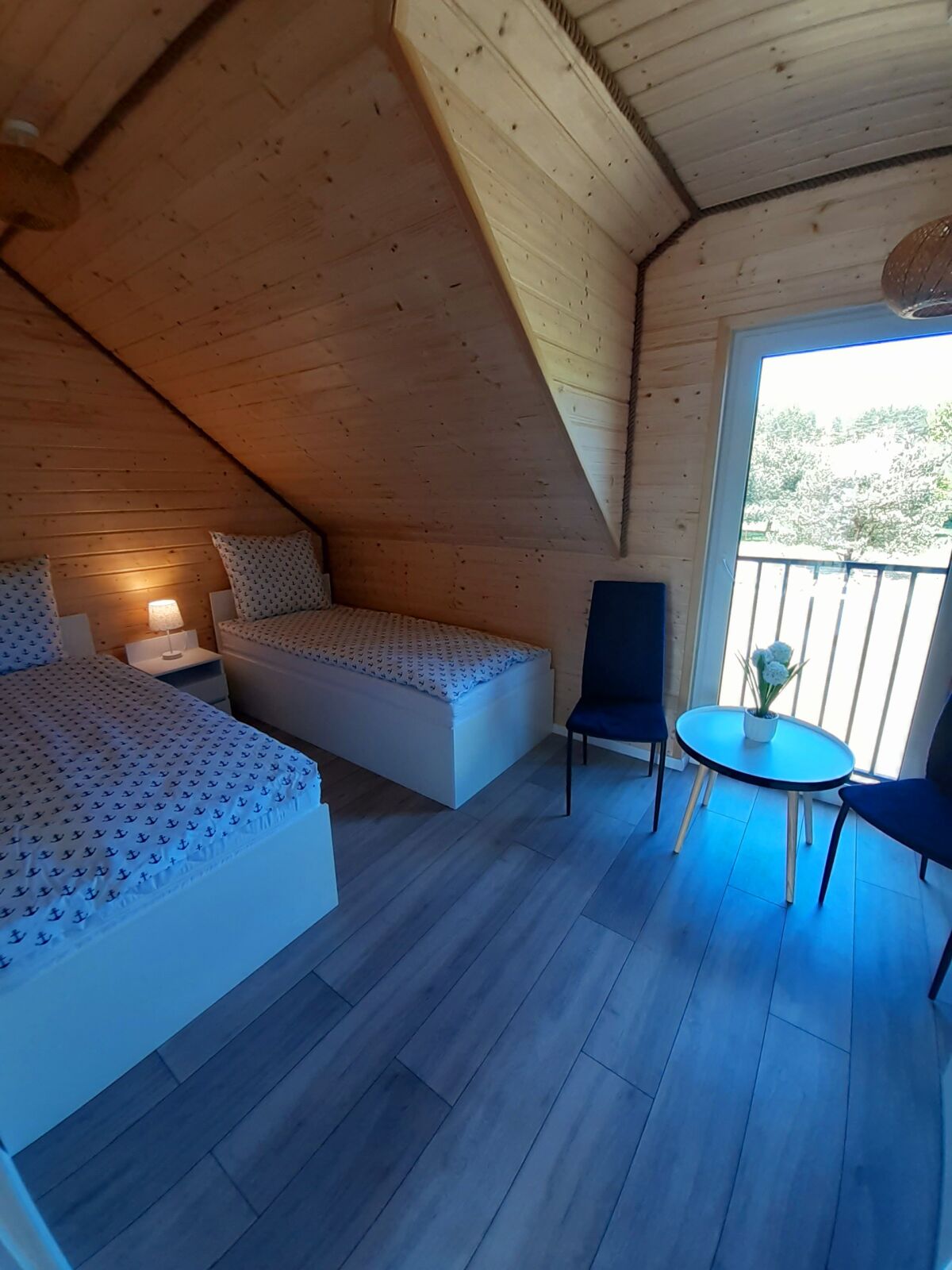 Domek dwupiętrowy drewniany (4–7 osób) – komfortowy, z łazienką, aneksem kuchennym oraz prywatnym miejscem na grilla