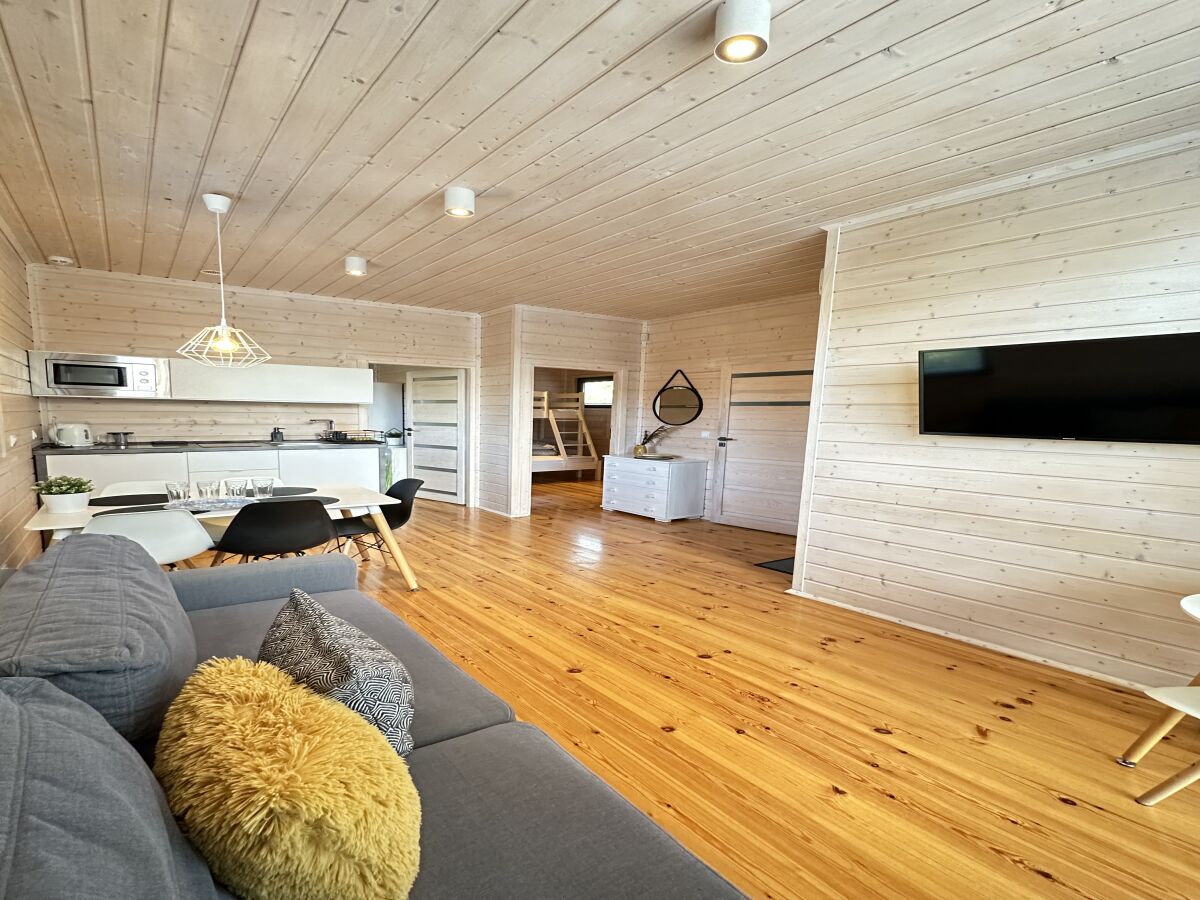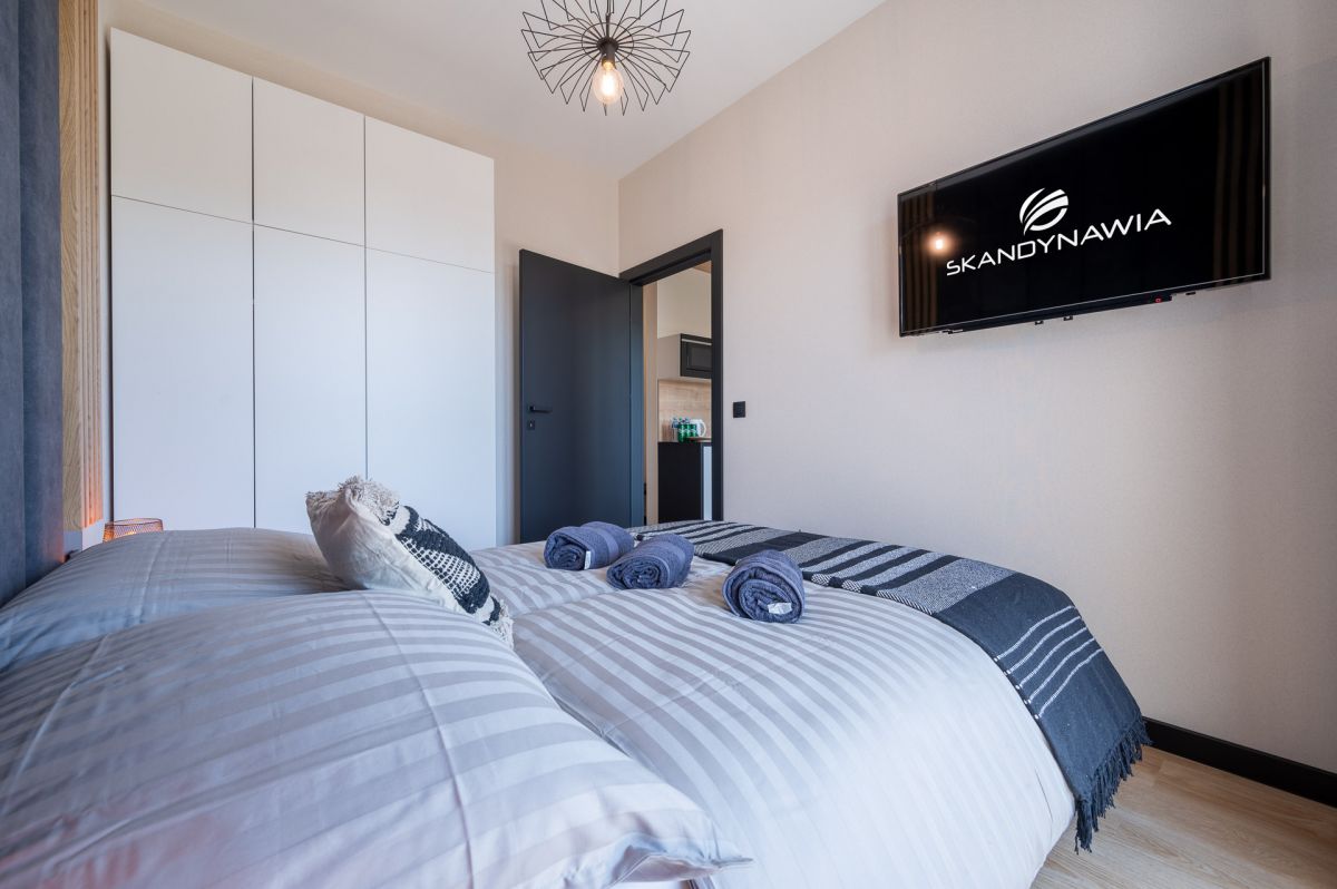 • salon dzienny: 2-osobowa rozkładana sofa wypoczynkowa, komplet pościeli antyalergicznej, pojemna szafa, stół z krzesłami, telewizor LCD 40 cale, TV sat, internet, żelazko + deska do prasowania;