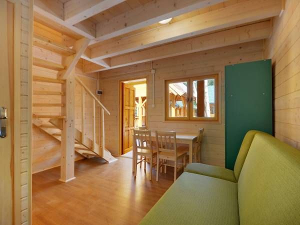 Domki są dwukondygnacyjne, o powierzchni 48 m2 + 6 m2 zadaszonego tarasu z zestawem ogrodowym. Są przeznaczone do pobytu max. 6 osób. Na parterze znajduje się salon z wypoczynkiem, stołem jadalnianym z krzesłami, wyposażony aneks kuchenny (lodówka, płyta grzewcza, czajnik, mikrofalówka, garnki, sztućce, naczynia) oraz łazienka z zestawem prysznicowym. Na piętrze znajdują się dwie oddzielne sypialnie, każda wyposażona w dwa łóżka jednoosobowe oraz szafki.