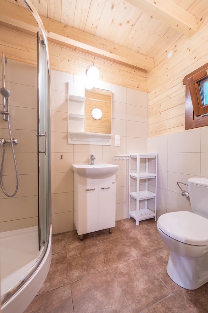 Domek piętrowy wolnostojący - 6-8 osobowy o powierzchni ok. 50 m², komfortowo wyposażony. Na dolnej kondygnacji jest łazienka, telewizor LCD, Wi-Fi, lodówka, czajnik elektryczny, naczynia stołowe, stół kawowy, dwa łóżka pojedyncze oraz rozkładana kanapa 2-osobowa. Na piętrze są dwa pokoje, jeden w formie antresoli, drugi zamykany. Przed domkiem jest weranda z meblami ogrodowymi (stolik + 4 krzesła).