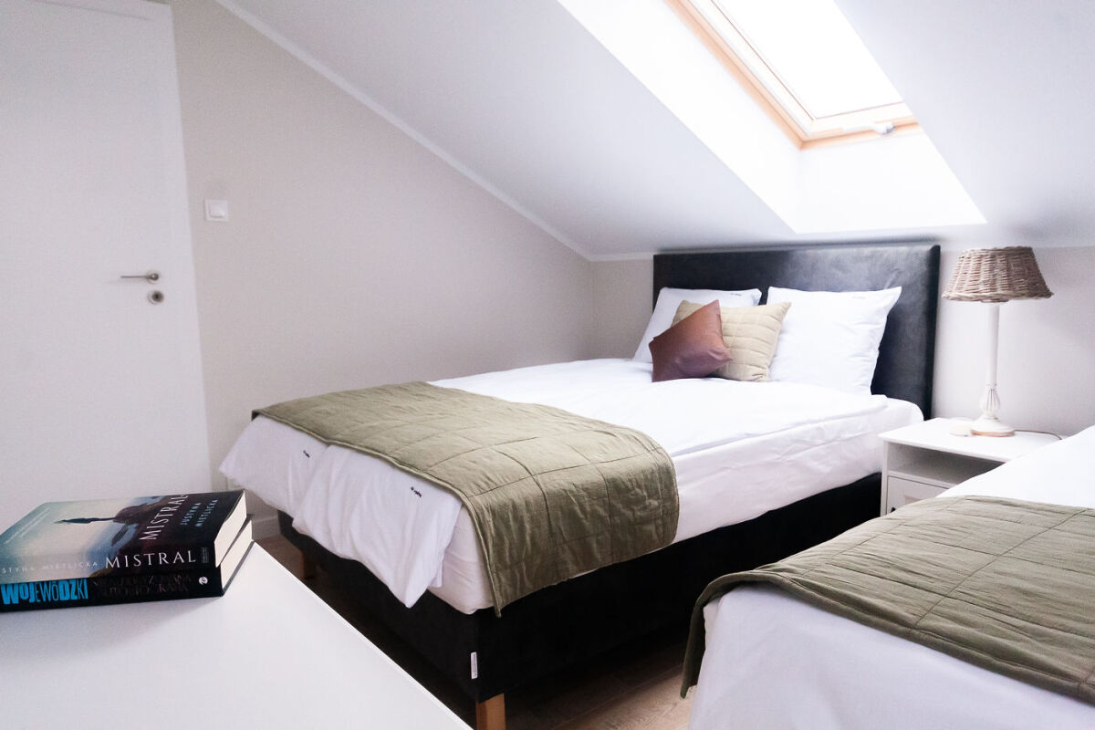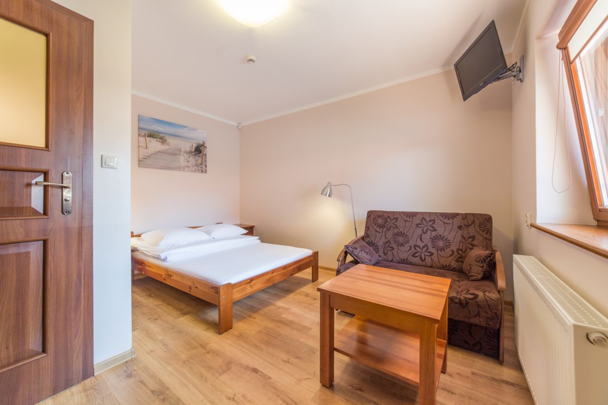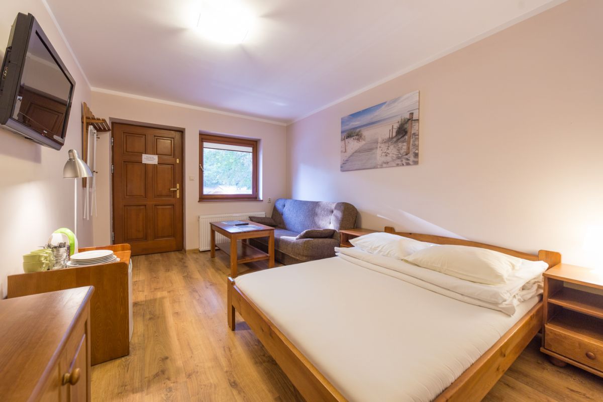 Pokój Family Plus - pokoje są dwupoziomowe, 2-6 osobowe o powierzchni ok. 40 m². Znajdują się na pierwszym piętrze w budynku A. Na dolnej kondygnacji jest łazienka, telewizor LCD, Wi-Fi, lodówka, szafa, stół kawowy, fotel oraz rozkładana wersalka 2-osobowa. Na górną kondygnację – antresolę prowadzą kręcone schody zamykane bramką. Przed pokojami znajdują się meble ogrodowe (stolik + 2 krzesła).