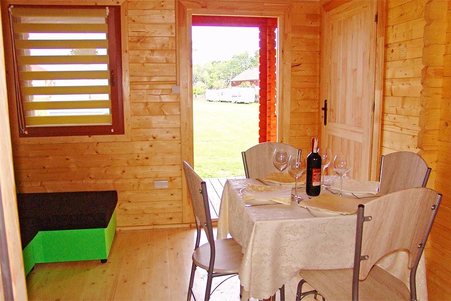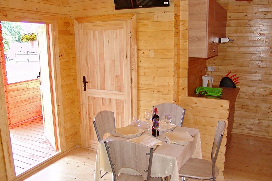 Nowe, drewniane domki letniskowe składają się z dwóch sypialni i salonu z aneksem kuchennym. W salonie znajduje się rozkładany narożnik, w sypialni łoże małżeńskie, a w drugiej piętrowe łóżko. Na tarasie stolik z krzesłami oraz grill. Zapewniamy bezpieczny zamykany parking, miejsce do rekreacji, place zabaw. Sprzęt plażowy: leżaki 5szt. oraz parawan.