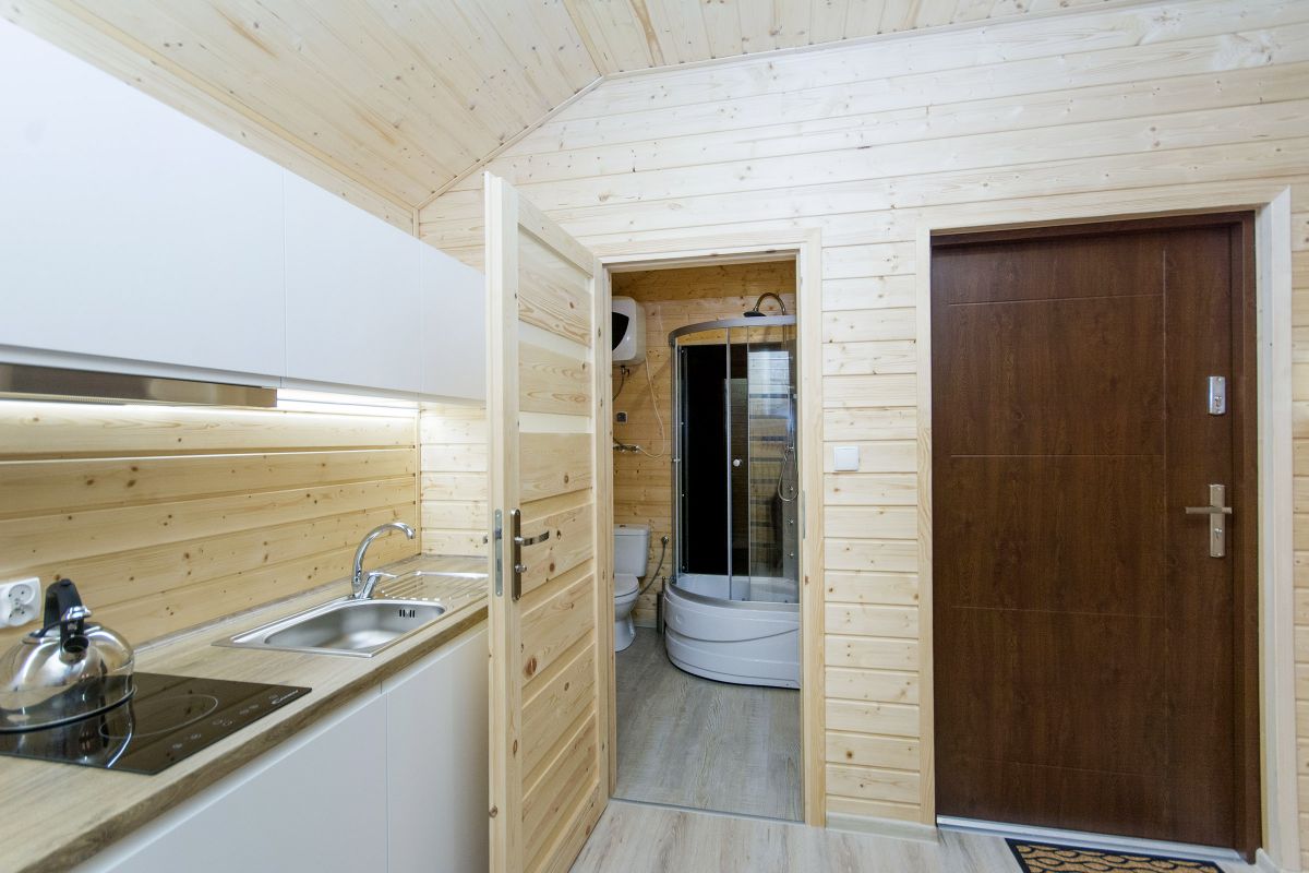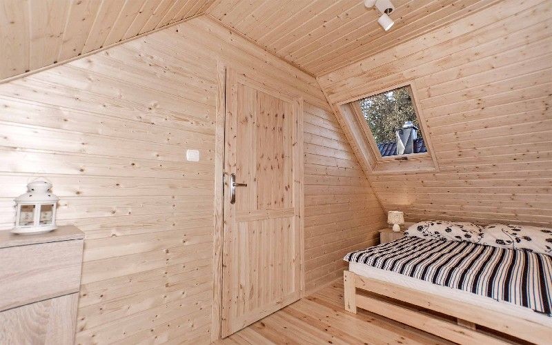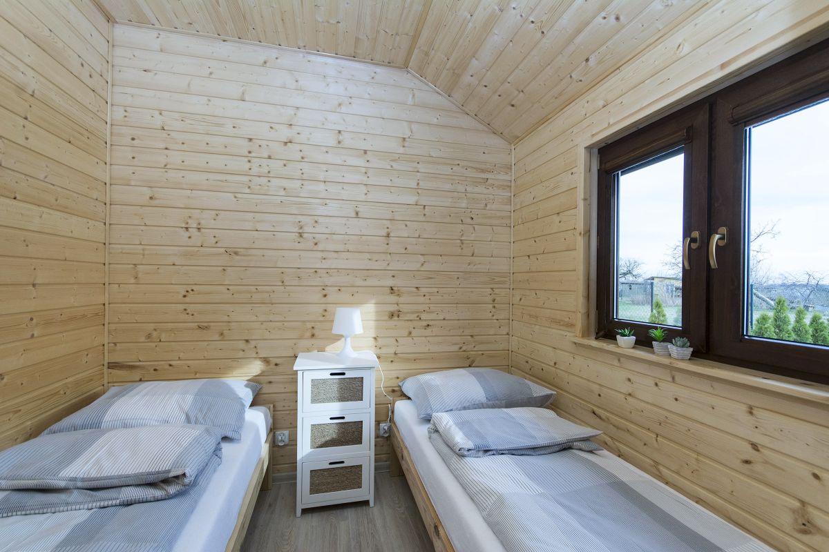 W Domkach całorocznych na parterze znajduje się duży salon z obszernym aneksem kuchennym (zmywarka, mikrofalówka, lodówka…), rozkładana sofa i klimatyczny kominek, który ogrzeje w chłodniejsze wieczory. Na piętrze znajdują się dwie sypialnie (mniejsza łóżko podwójne, większa dwa pojedyncze i dwa podwójne).