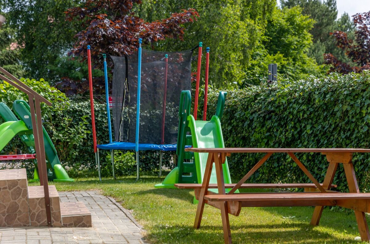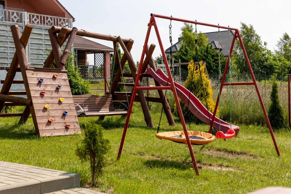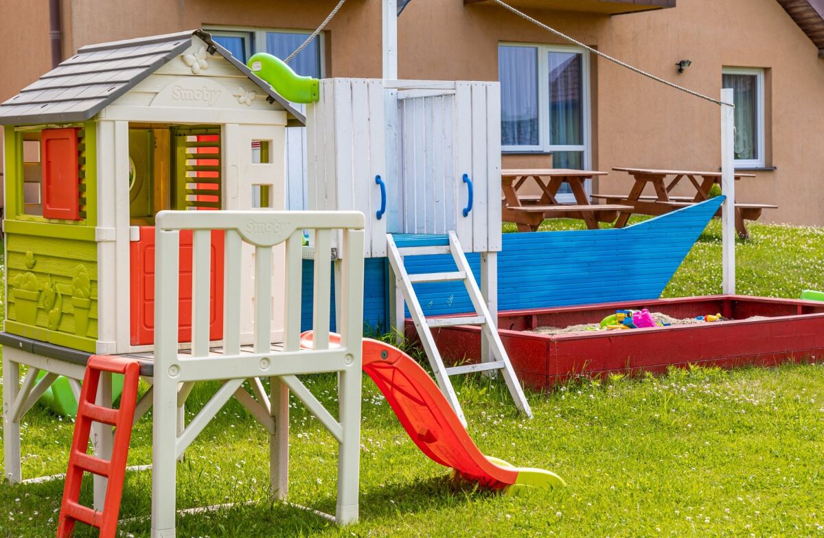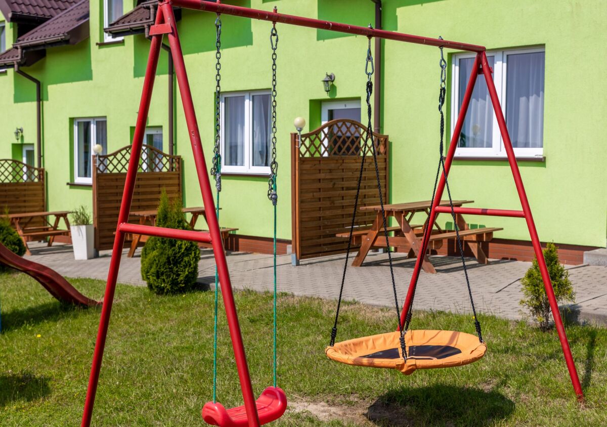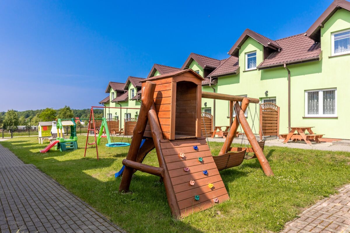 W aneksie kuchennym do Państwa dyspozycji oddajemy lodówkę, płytę kuchenną, komplet garnków, przybory kuchenne, czajnik,kuchenkę mikrofalową, oraz zastawę stołową dla 6 osób(dostawka w zależności od ilości osób). Na piętrze znajdują się dwie sypialnie, w tym jedna z łożem małżeńskim +kanapa dwuosobowa w drugiej znajdują się dwie kanapy rozkładana dwuosobowe. Poza tym sypialnie wyposażone są w szafki nocne, kołdry, poduszki, oraz pościel. Przed domkiem znajduje się ławostół . Ponadto każdy domek wyposażony jest w parawan, żelazko oraz deskę do prasowania . Plac zabaw zadowoli starsze i młodsze dzieci (zestawy huśtawek dla małych oraz większych dzieci, piaskownica,domki, zabawki, zjeżdżalnie .