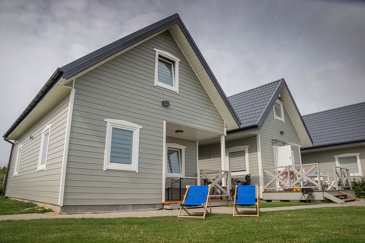 Powierzchnia domków to od 40, 45 m2 do ok. 60 m2 z dużym zadaszonym tarasem. Budynki zaprojektowane zostały tak, aby każdy z nich posiadał niezależne wejście z obszernym tarasem oraz strefę wypoczynku w ogrodzie (basen z podgrzewaną wodą, leżaki i parasole, sauna ze strefa relaksu, jakuzzi, leżakiduży profesjonalny plac zabaw dla dzieci: -huśtawki,