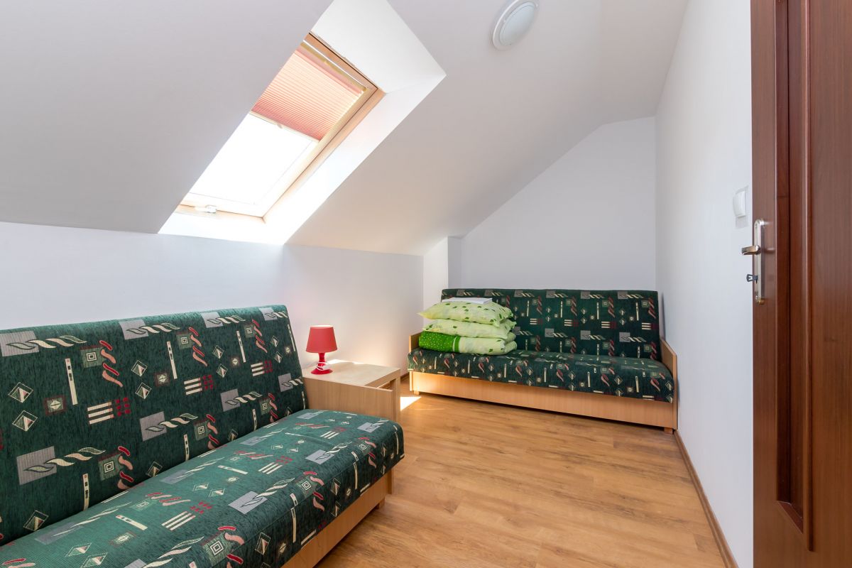 Na piętrze znajdują się dwie sypialnie osobno zamykane. Jedna z łożem małżeńskim i dostawką,lub kanapą dwuosobową, w drugiej znajdują się dwie kanapy rozkładane dwuosobowe. Poza tym sypialnie wyposażone są w stoliki,lampki, kołdry, poduszki, oraz pościel.Każda sypialnia posiada własną szafę.
