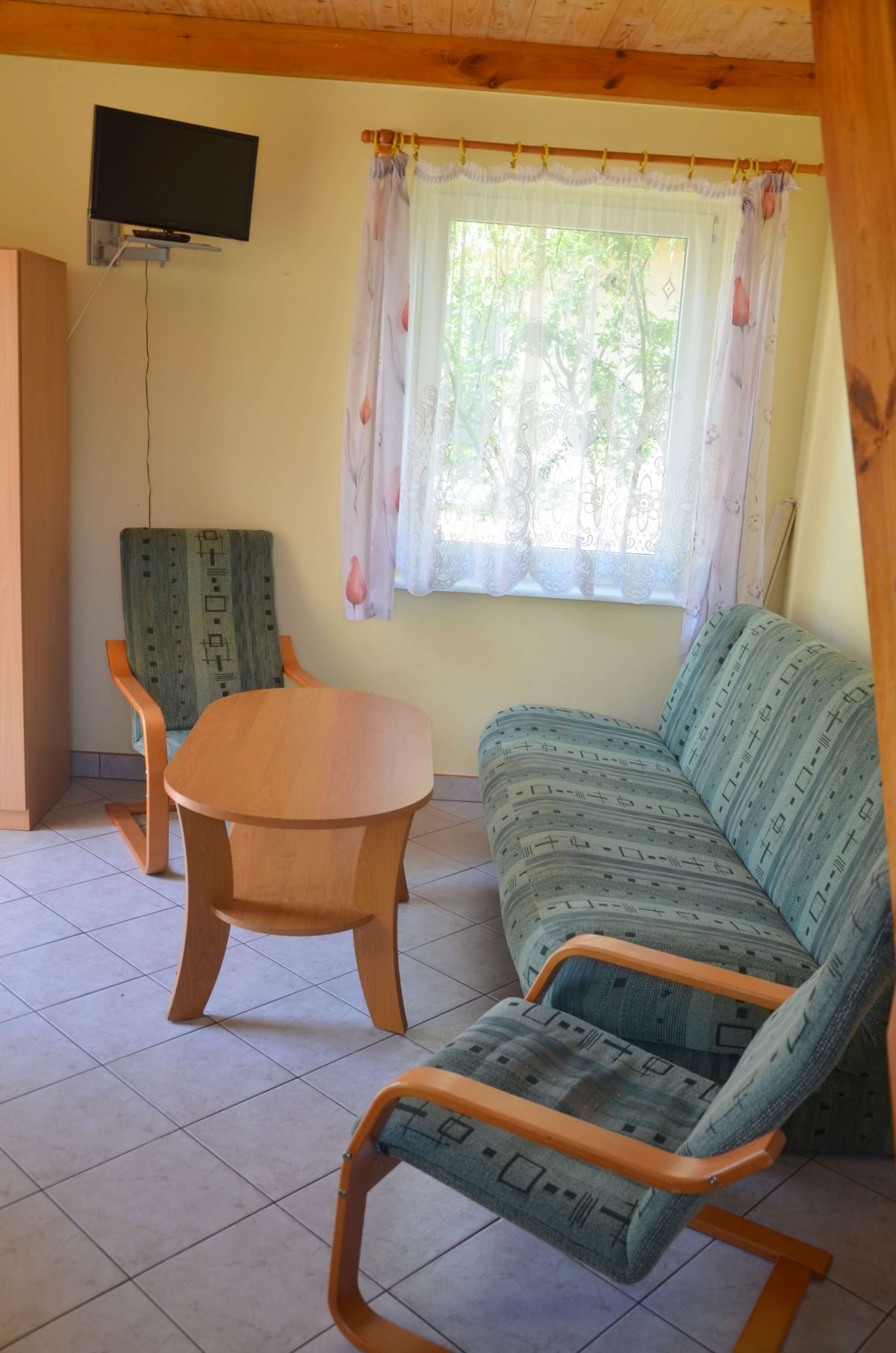 • pokój dzienny (TV, kanapa dwuosobowa, stolik, fotele, szafa)