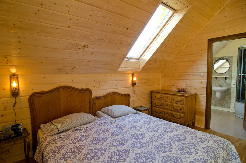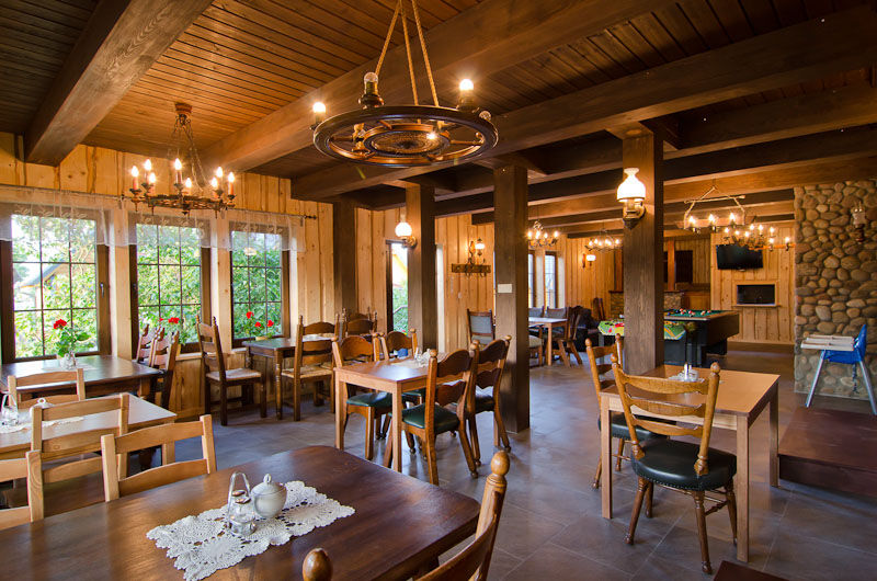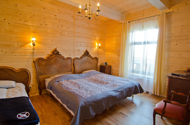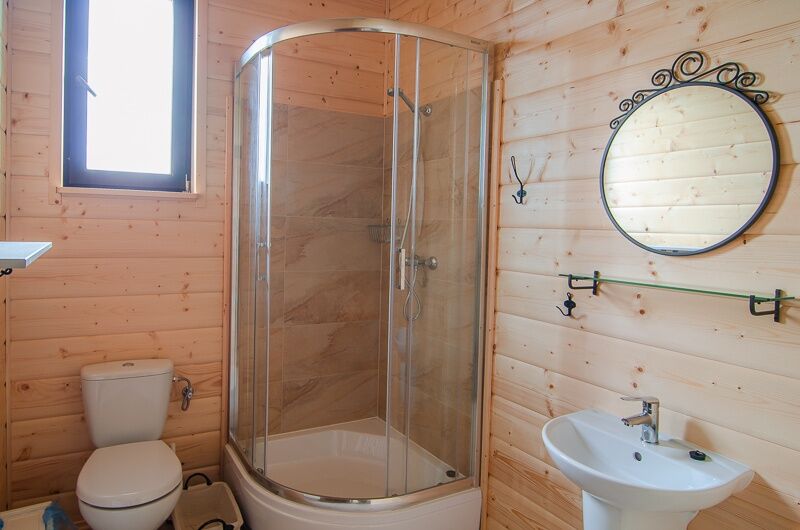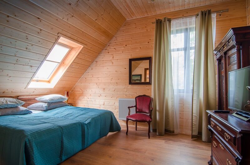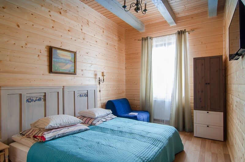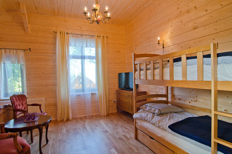 Pokoje gościnne z łazienkami znajdują się w dwóch drewnianych, stylowo urządzonych dworkach. W budynkach znajdują się ogólnodostępne, w pełni wyposażone kuchnie, w których mieszkańcy każdego pokoju mają do dyspozycji własną lodówkę i szafkę na zapasy.