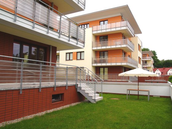 Apartamentowiec o wysokim standardzie z widokowym tarasem na dachu budynku , położony jest w strefie uzdrowiskowej Kołobrzegu na obrzeżach pięknego parku nadmorskiego z rozbudowaną siecią ścieżek rowerowych. Apartament 40 m z pełnym wyposażeniem dwa pokoje z aneksem kuch., duży taras i ogródek 100 m ogrodzony do dyspozycji gości wyłącznie z tego apartamentu, idealny do relaksu i zabaw dla dzieci.