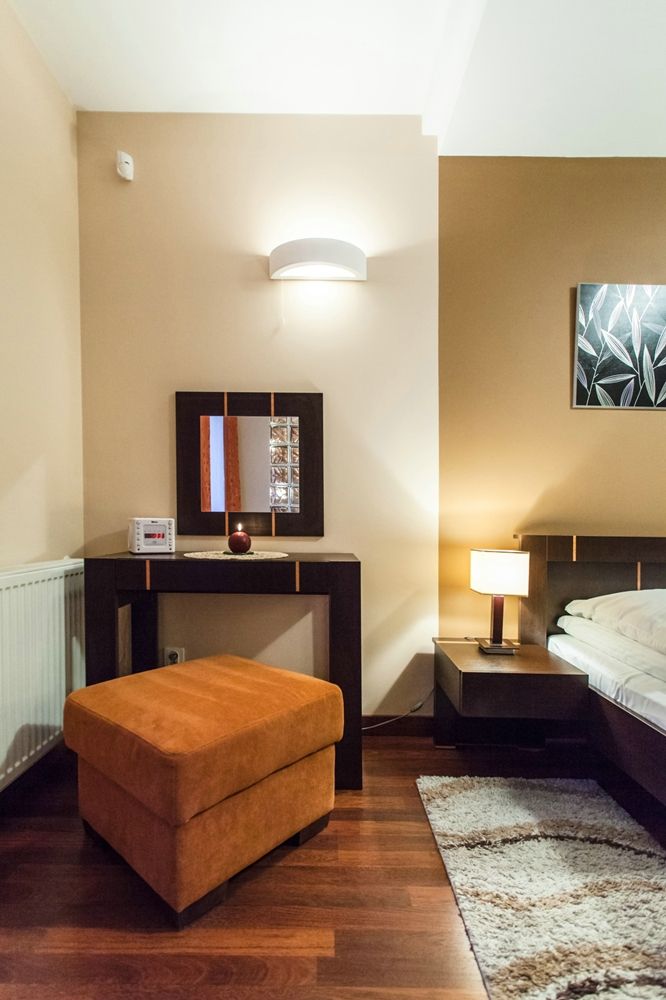 Sypialni z dużym podwójnym łożem (160x200cm), toaletką oraz dużą pojemną garderobą na ubrania, a także sejf;