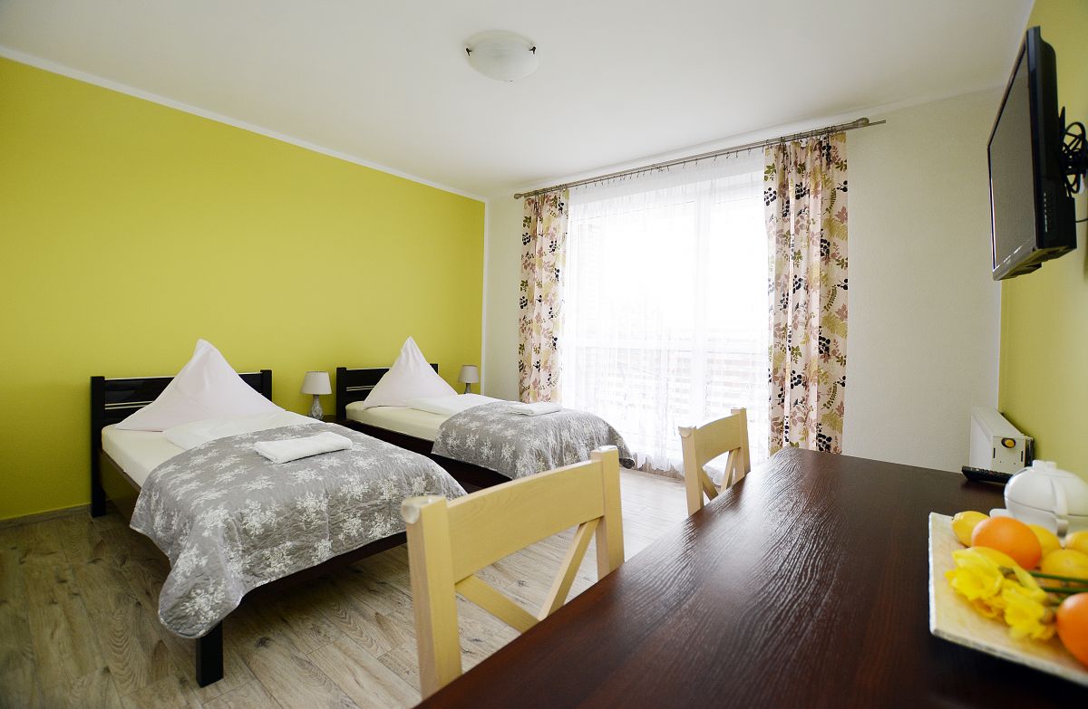 Do dyspozycji Gości oddajemy duże i wygodne pokoje (o pow. 25m2) - każdy z nich posiada własną łazienkę oraz duży balkon lub taras. Pokoje wyposażone są w przestronne szafy, wygodne łóżka z materacami, biurka i krzesła.W pokoju TV , Wi Fi , lodówka ,czajnik.