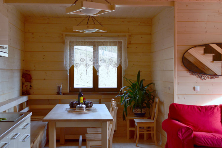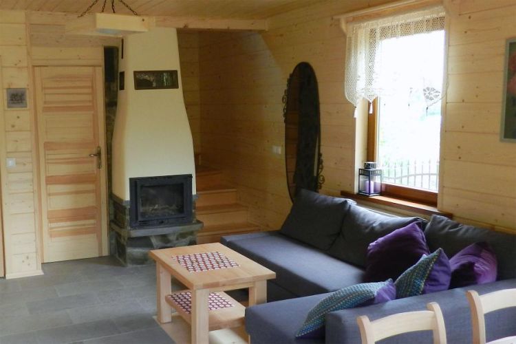 Parter: aneks kuchenny, salon z kominkiem, łazienka, sypialnia 2-os.