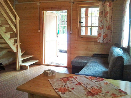 Domek dwupoziomowy (bliźniak z bali) z aneksem kuchenny i łazienką (z prysznicem).