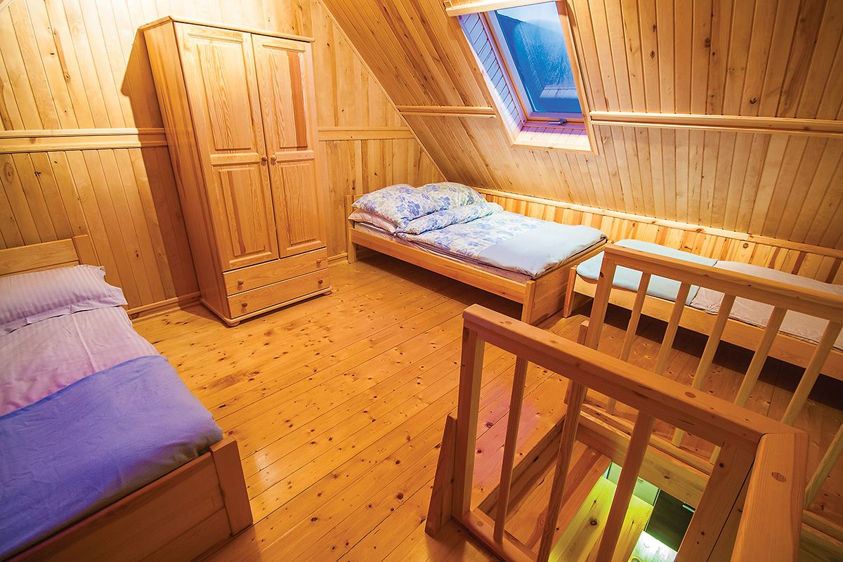 Pokój na piętrze przeznaczony jest dla 4 osób (jedno łóżko dwuosobowe, dwa jednoosobowe)