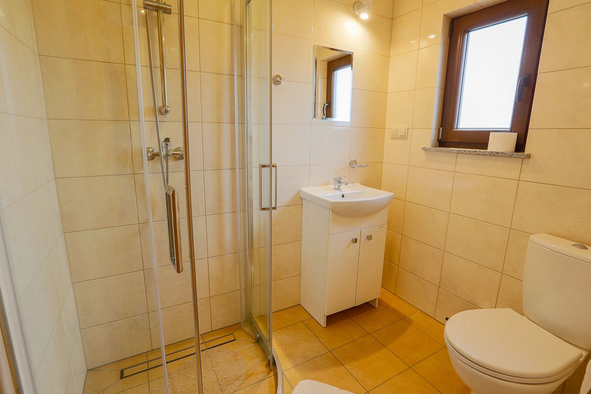 W każdym z apartamentów znajduje się także w łazienka z kabiną prysznicową, toaletą oraz umywalką.