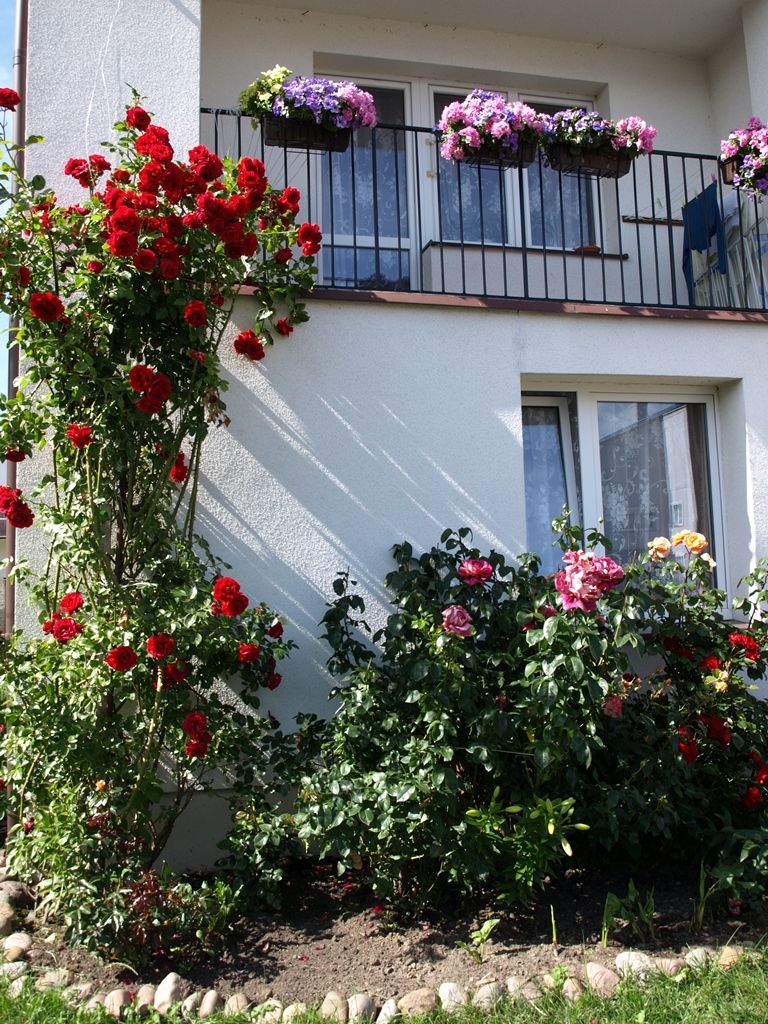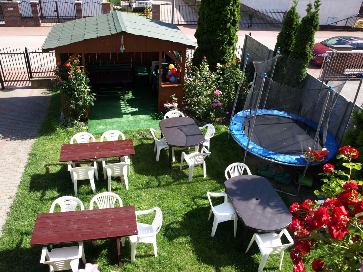 NA POSESJI za domem i po bokach jest bezpłatny parking z wyjazdem, a z przodu jest altana, stoliki, , trampolina dla dzieci i dużo pachnących kwiatów.