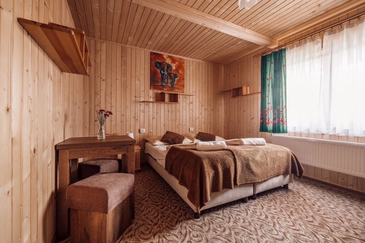 Dom Wczasowy Maria oferuje 52 miejsca noclegowe w przytulnych pokojach w stylu góralskim, z łazienkami i pięknymi widokami na góry. Nasz obiekt otacza zielony ogród z placem zabaw, trampoliną, boiskami oraz miejscem na ognisko. Dla grup i dzieci przygotowaliśmy dużą przestrzeń wspólną – salę ok. 90 m² z rzutnikiem, kącikiem zabaw, ping-pongiem i piłkarzykami, a także salę taneczną i sportową.