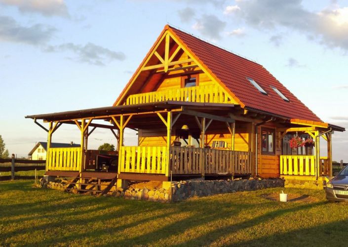 Domek posiada wszystko to, co potrzebne: salon, aneks kuchenny i łazienkę. Na piętrze znajduje się jeden duży pokój. Na terenie działki znajduje się miejsce na ognisko i grilla oraz parking. Komfortowemu wypoczynkowi na świeżym powietrzu sprzyja duży taras z ławami i stołem. To idealne miejsce dla miłośników pieszych wycieczek, rowerowych wędrówek oraz fanatyków sportów wodnych!