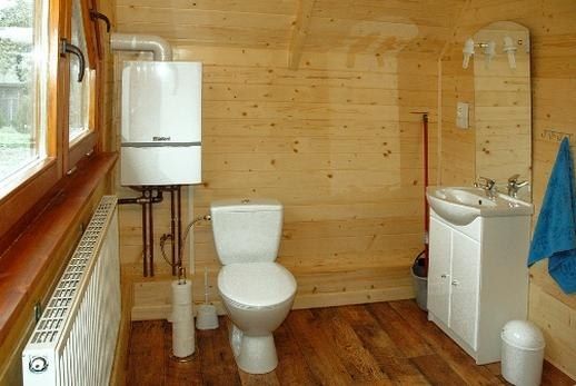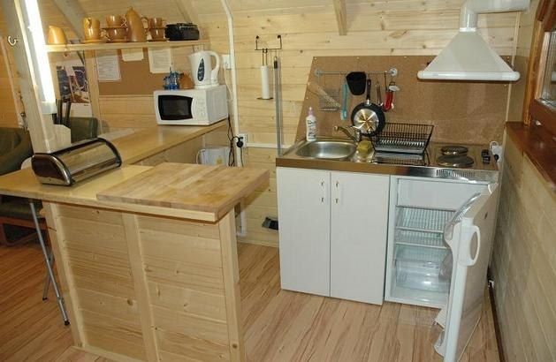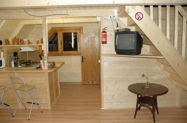 W każdym z domków znajdują się: 2 sypialnie (w każdej 2 tapczany pojedyncze bądź podwójne jak i szafki nocne), pokój dzienny (narożnik - wersalka, stół, 2 fotele, 2 krzesła barowe przy ladzie, TV i 2 szafy), aneks kuchenny (lodówka z zamrażalnikiem, kuchenka elektryczna, kuchenka mikrofalowa, zlewozmywak, czajnik bezprzewodowy, zastawa stołowa dla 8 osób), łazienka (kabina natryskowa, wc, umywalka, lustro), taras (stolik, krzesła).