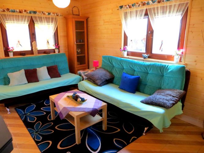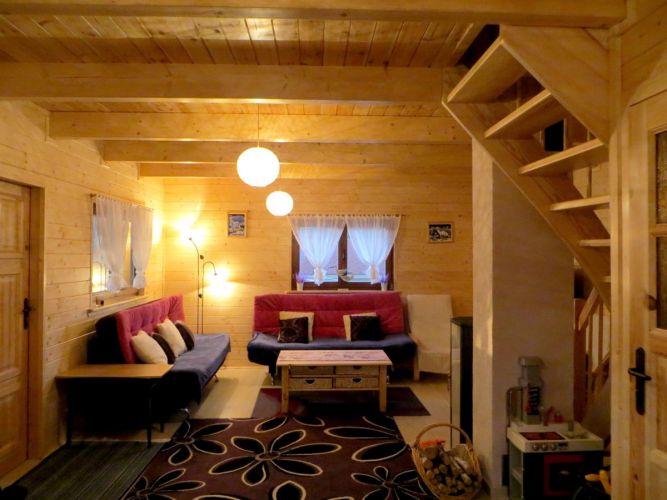 Salon parter: dodatkowe spanie - dwie kanapy dwuosobowe, kominek, TV, kącik zabawowy dla dzieci, krzesełko do karmienia dzieci, wanienka, trampolina.