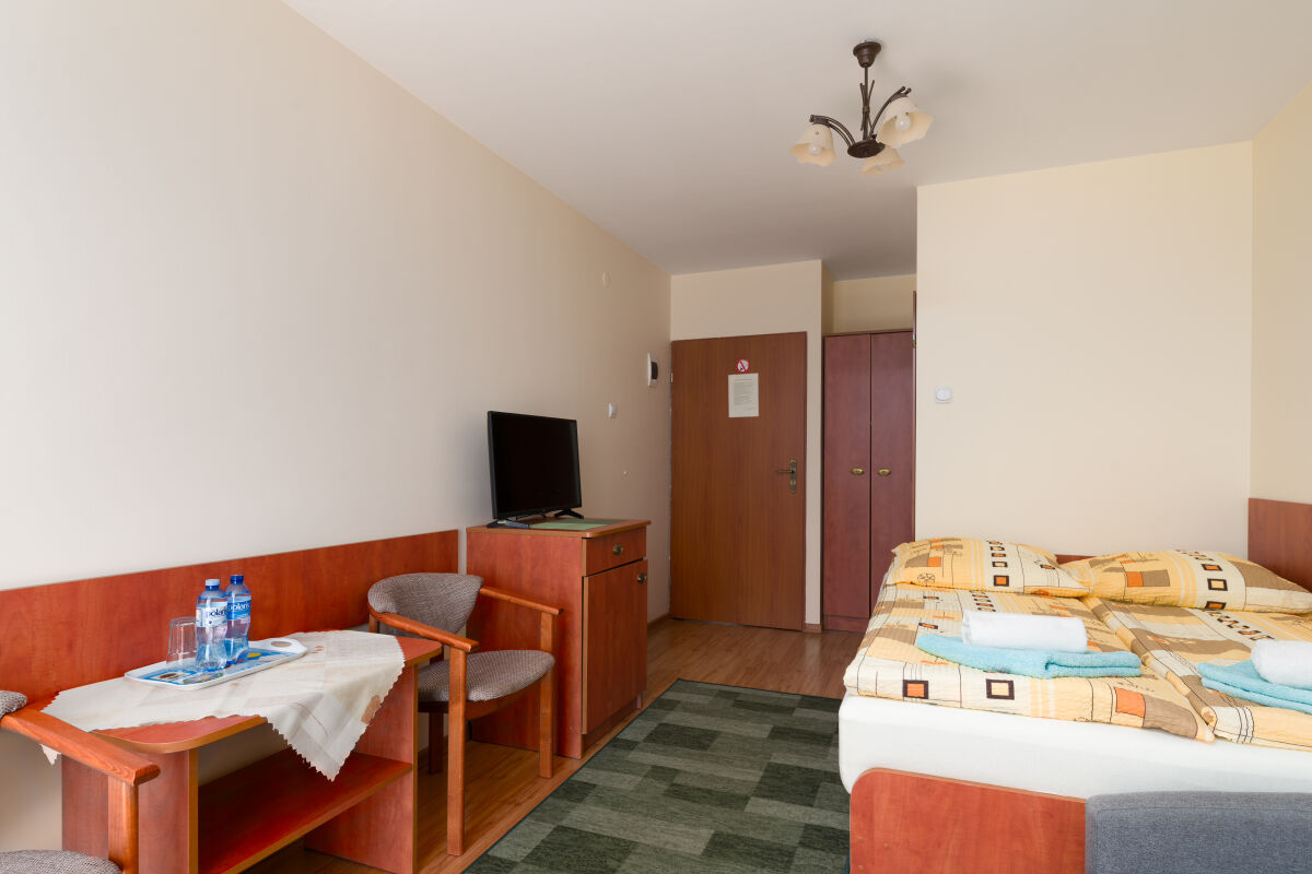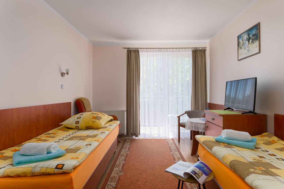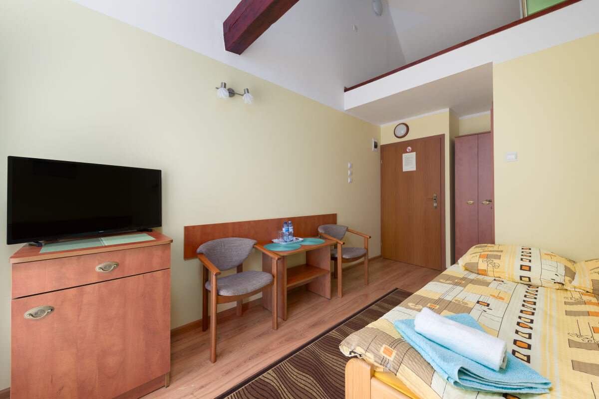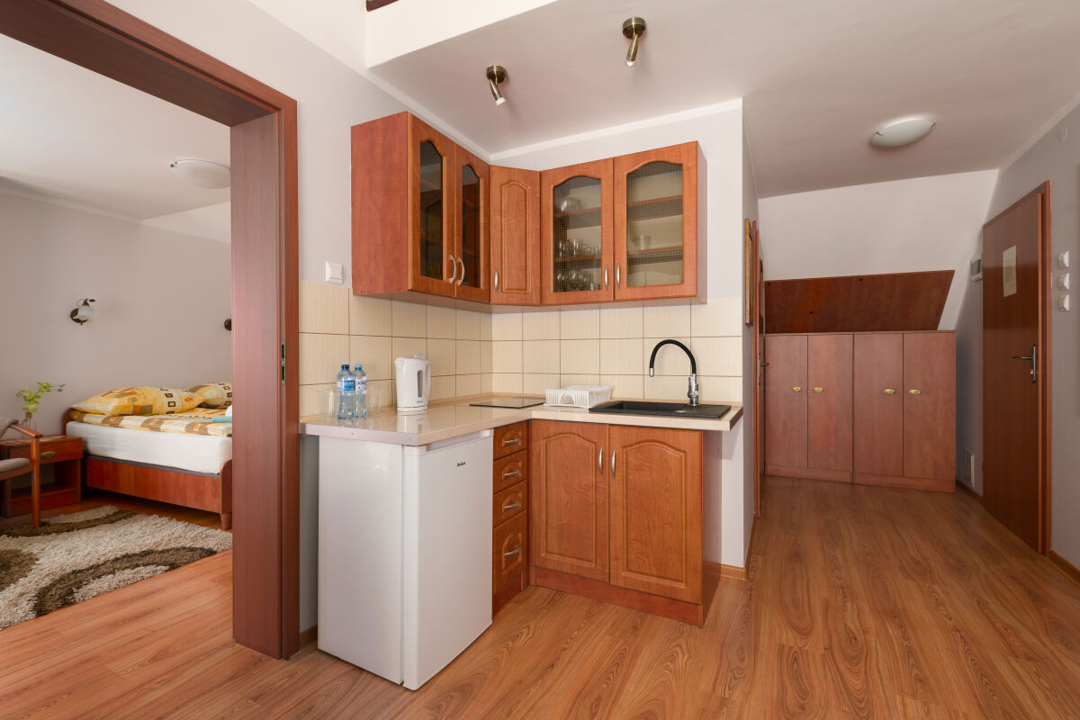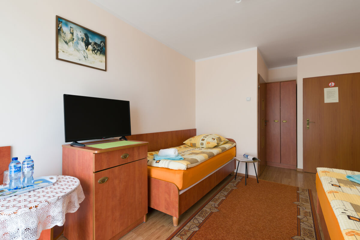 Wszystkie pokoje wyposażone są w prywatne łazienki, telewizory oraz lodówki, a większość z nich posiada balkony. Do dyspozycji Gości przygotowaliśmy także aneksy kuchenne na I i II piętrze z czajnikami elektrycznymi, kuchenką mikrofalową i niezbędnymi naczyniami.