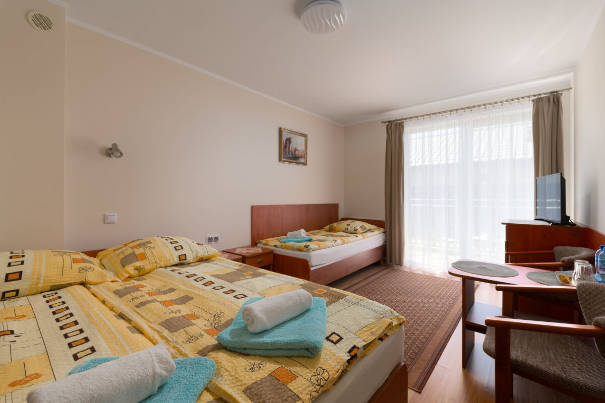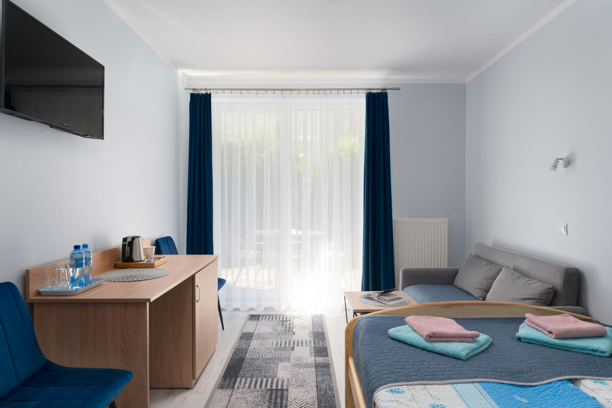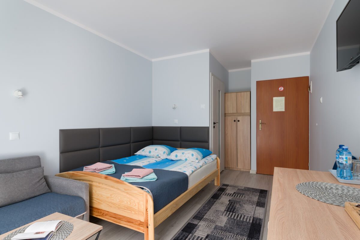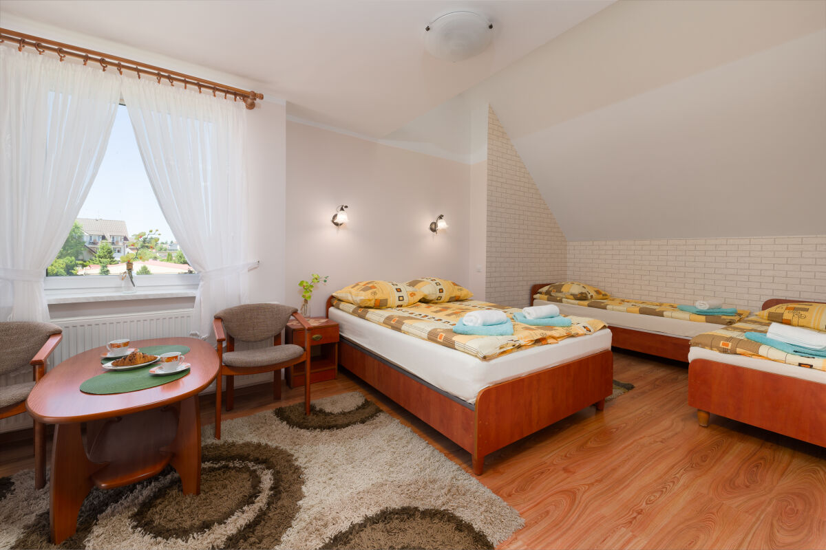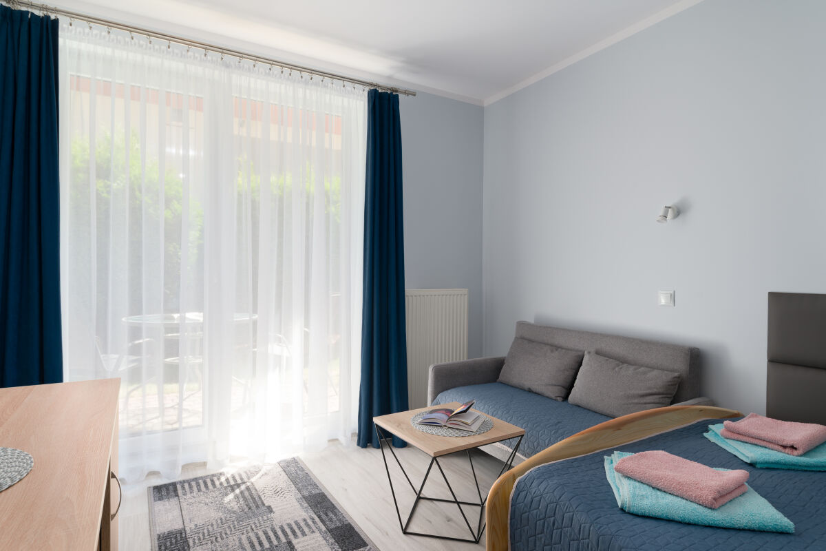 Oferujemy wygodne pokoje 2- i 3-osobowe oraz przestronne, dwupokojowe studia rodzinne dla 4–5 osób. Łącznie dysponujemy około 50 miejscami noclegowymi, idealnymi na rodzinne wakacje nad morzem.