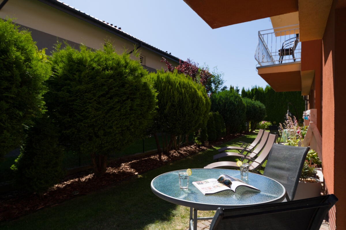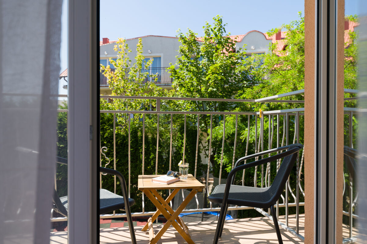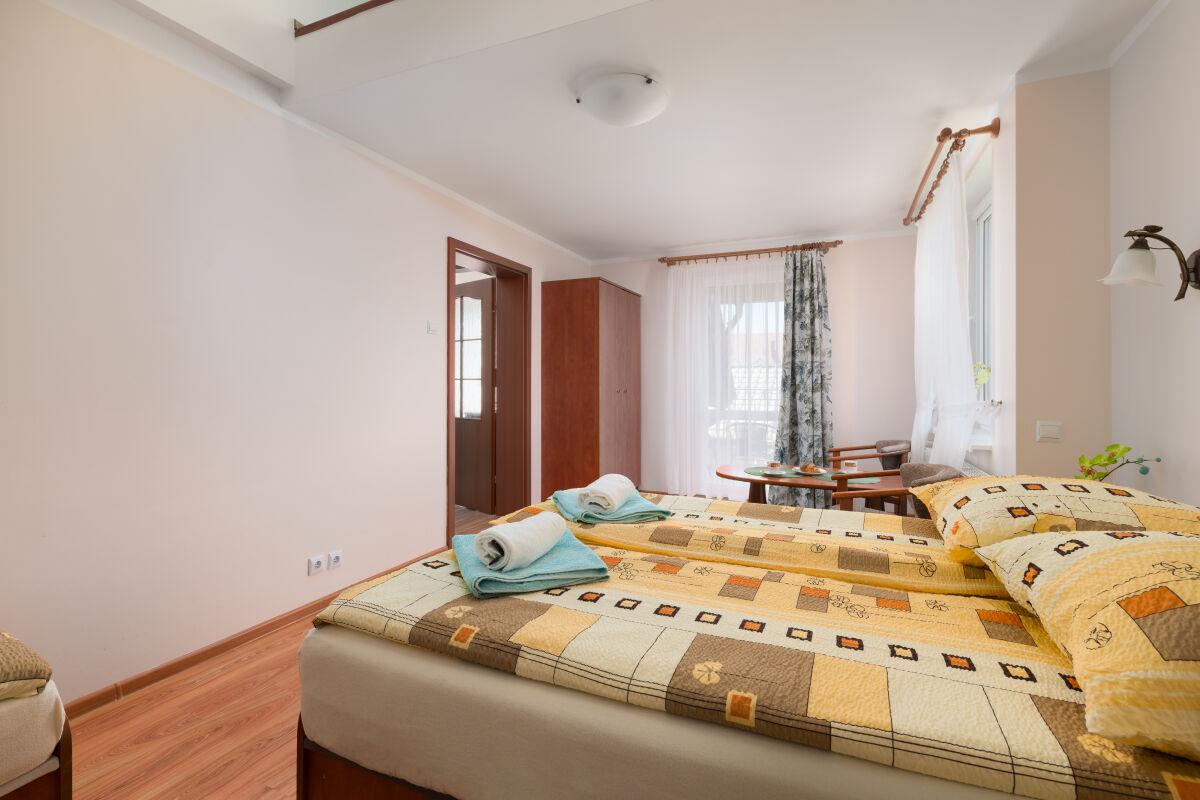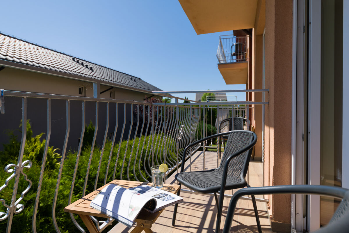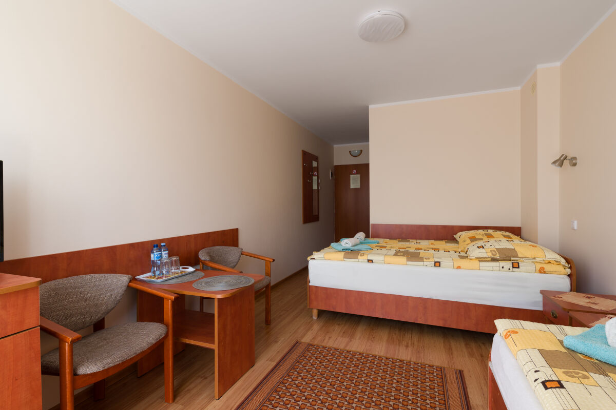 Oferujemy wygodne pokoje 2- i 3-osobowe oraz przestronne, dwupokojowe studia rodzinne dla 4–5 osób. Łącznie dysponujemy około 50 miejscami noclegowymi, idealnymi na rodzinne wakacje nad morzem.