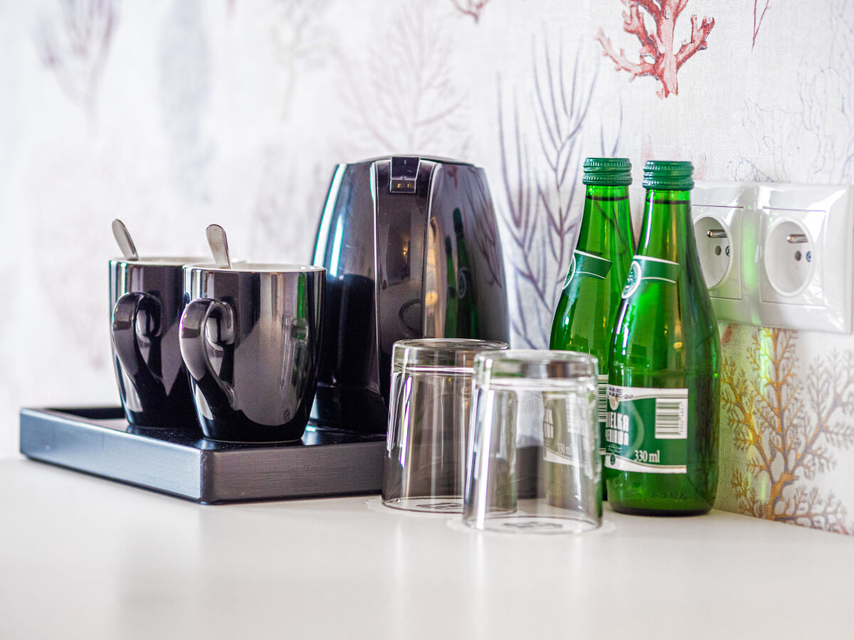 TV LCD, internet WI-FI, telefon, lodówkę, czajnik z filiżankami, wodę mineralną na powitanie, łazienkę z kabiną prysznicową, suszarką do włosów i ręcznikami hotelowymi.