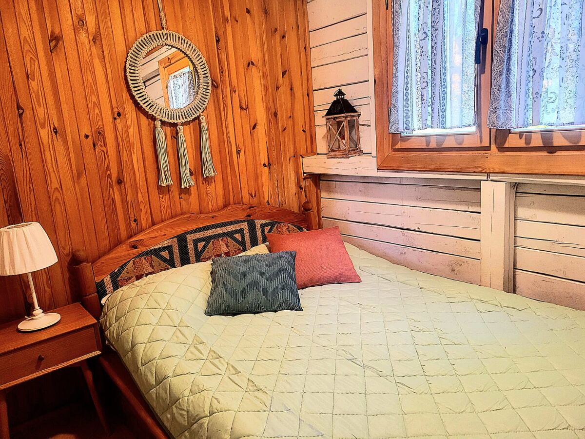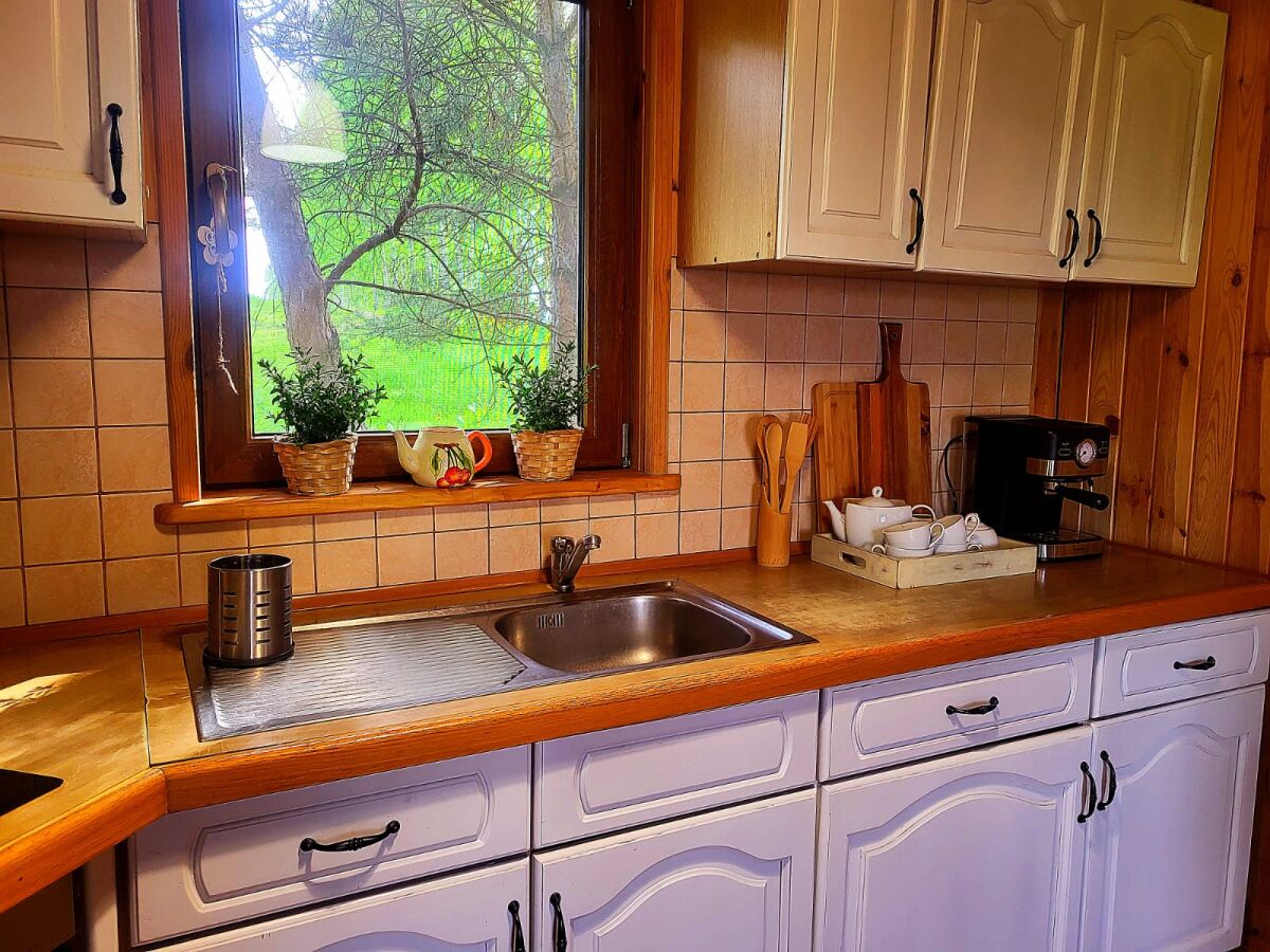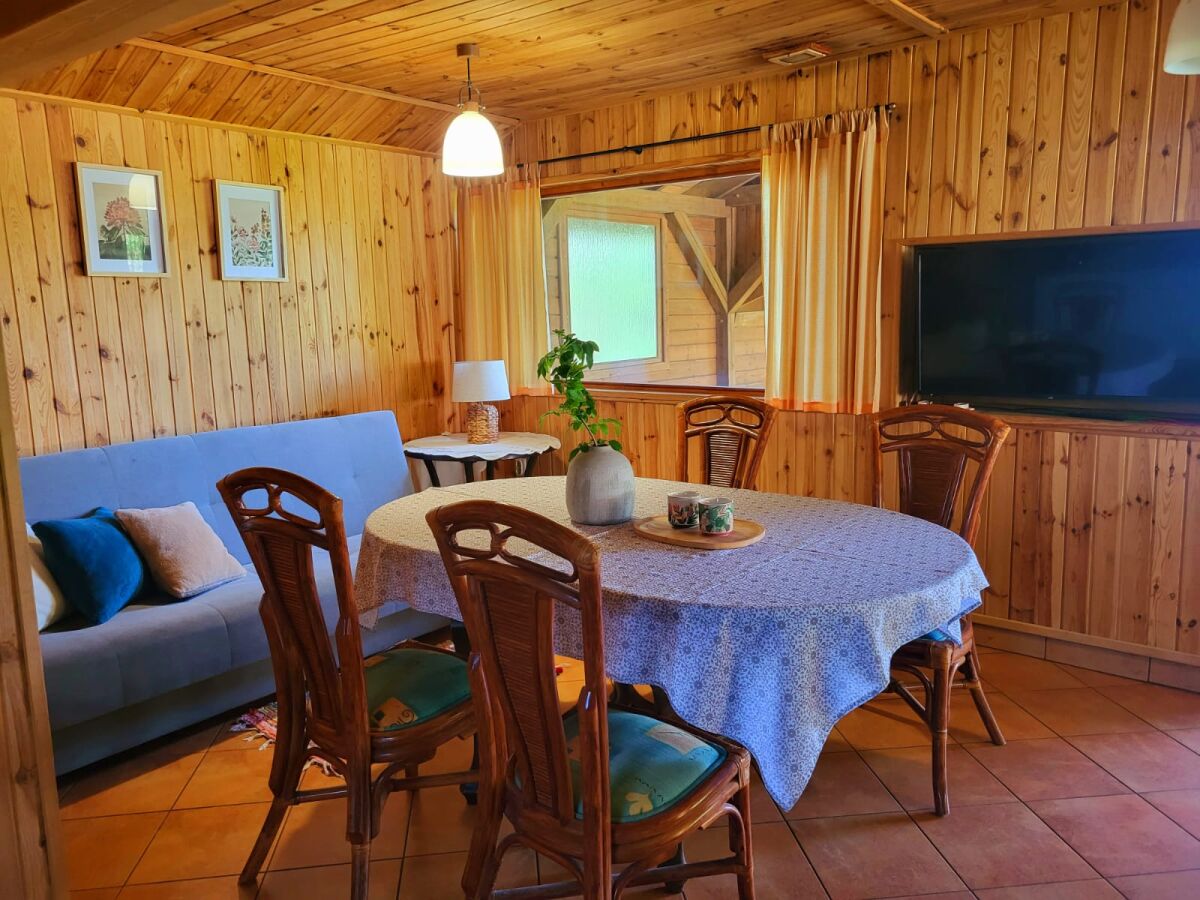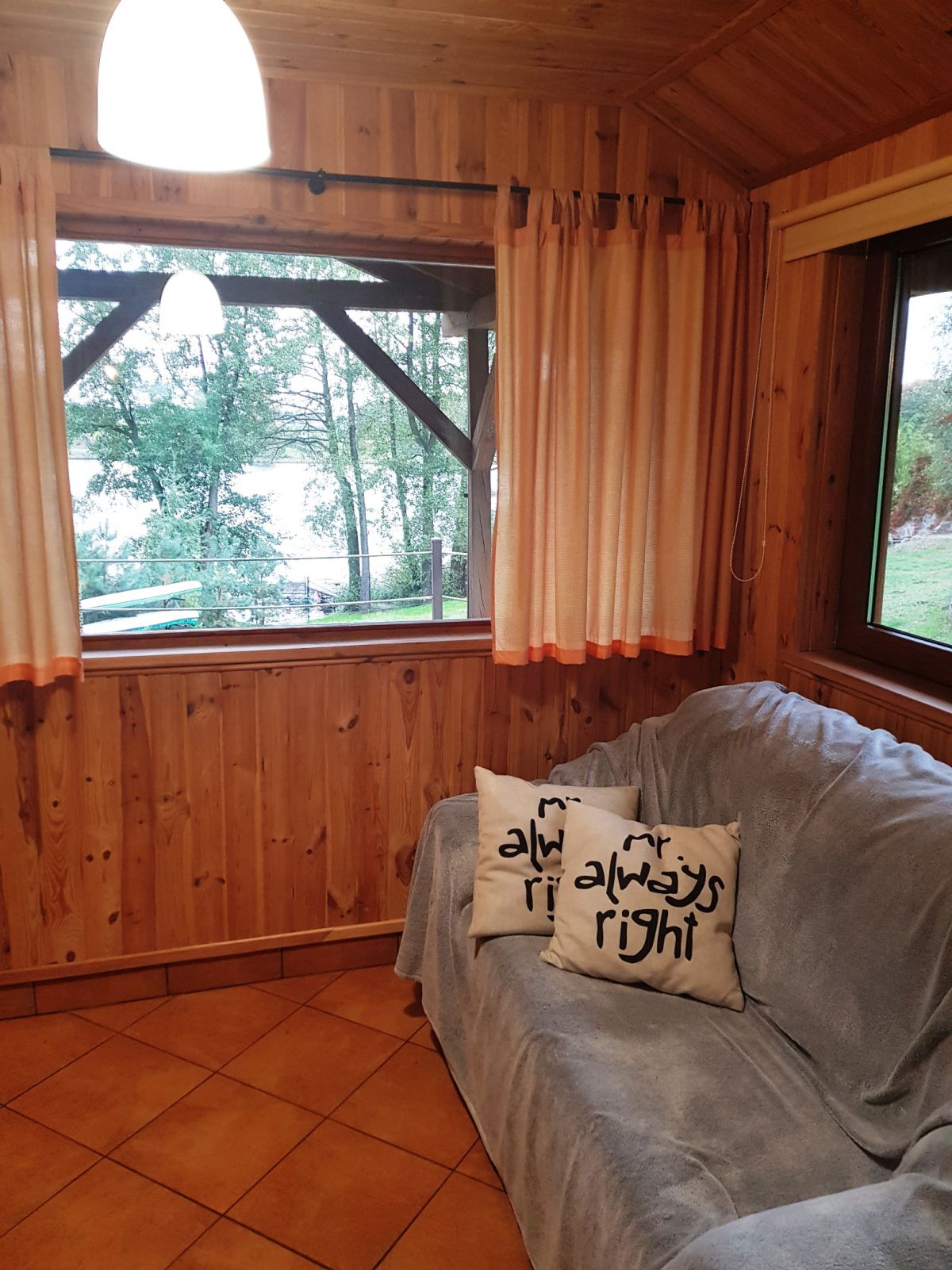 W domku salon z kominkiem i TV połączony z kuchnią ze standardowym wyposażeniem. Łazienka wykaflowana z kabiną. W salonie sofa rozkładana 2 os.dalej wnęka sypialniana oddzielona kominkiem i łóżko 2 os.