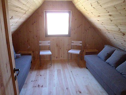 W środku znajduje się salon z aneksem kuchennym, łazienka z prysznicem i WC oraz dwa pokoje na górze. Jeden pokój dwuosobowy (łózko pojedyncze i materac) i jeden czterosobowy (dwie rozkładane kanapy), jest możliwość spania również w salonie (rozkładana dwuosobowa sofa). Łącznie 8 miejsc noclegowych z kompletami pościeli.