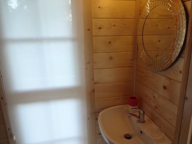 W domku znajduje się łazienka, aneks kuchenny z wyposażeniem oraz malutka sypialnia.