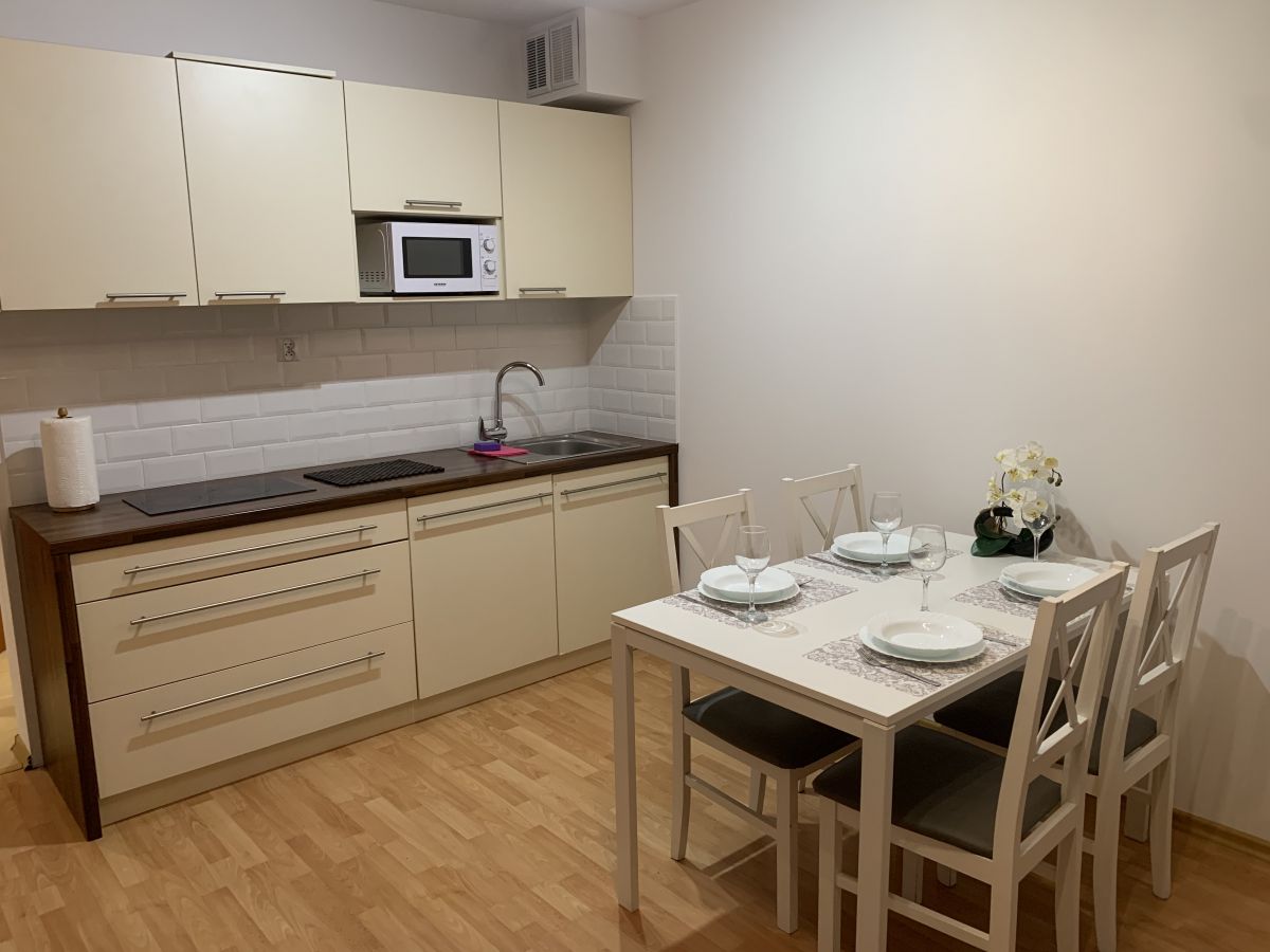 • W pełni wyposażony aneks kuchenny ( lodówka, płyta ceramiczna, czajnik elektryczny, mikrofalówka, garnki, sztućce, kieliszki do wina itp.). Stół jadalniany oraz cztery krzesła