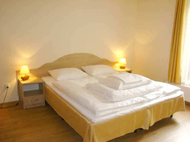 Apartamenty dwupokojowe z aneksami kuchennymi o powierzchni 40 m.kw. oferują Państwu oddzielny pokój-sypialnię z podwójnym łóżkiem i dodatkowym pojedynczym łóżkiem, pokój dzienny połączony wygodnie z kuchnią oraz możliwością wyjścia na balkon. Pokój wyposażony jest w jedną lub dwie oddzielne rozkładane sofy do spania, TV, stół z krzesłami umożliwiającymi spożywanie posiłków. W kuchni poza podstawowym wyposażeniem znajduje się stolik z dwoma taboretami. Na balkonie ustawiliśmy dla Państwa stolik z krzesłami. W skład apartamentu wchodzi również łazienka z prysznicem i WC.