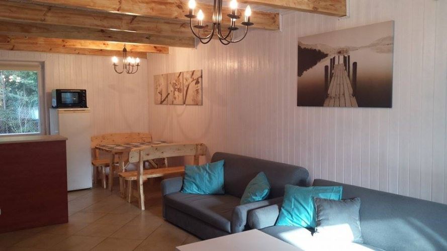 4 sypialnie, salon z kominkiem, wyposażona kuchnia z jadalnią (zmywarka, piekarnik, lodówka, indukcja, naczynia), łazienka z prysznicem (pralka), 2 WC, sauna, 2 duże tarasy i garaż. Do dyspozycji: huśtawka, meble ogrodowe, kładka, kamienny grill, TV, kominek z drewnem. Działka trawiasta, domek przyjazny dla rodzin z dziećmi.