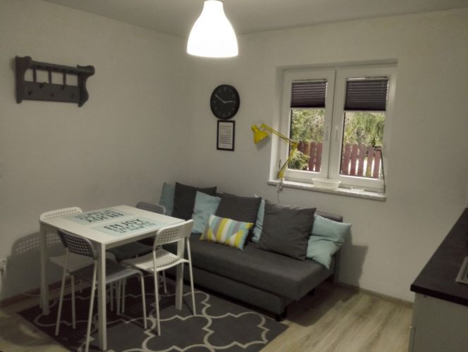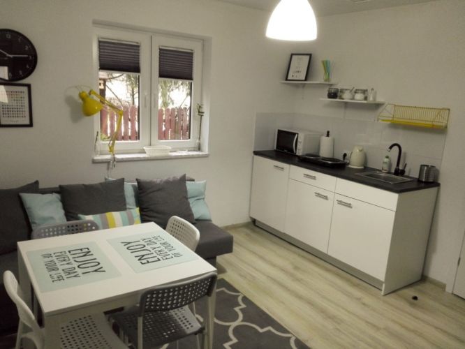 Domek posiada dwie oddzielne sypialnie, salon w ktorym znajduje się komfortowa, rozkładana kanapa, łazienka z prysznicem. Aneks kuchenny jest w pełni wyposażony- zastawa stołowa, czajnik, lodówka, ekspres do kawy. Domek urządzony jest w nowoczesnym stylu, idealny dla par na romantyczny wyjazd, jak i rodzin z dziećmi.