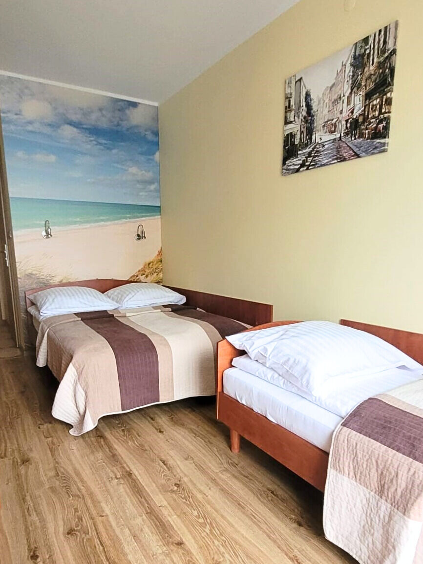 Posiadamy 2,3 i 4 osobowe pokoje z łazienkami. Wyposażone w ręczniki, suszarka do włosów czajnik, TV, lodówkę, parawan i koc na plażę
