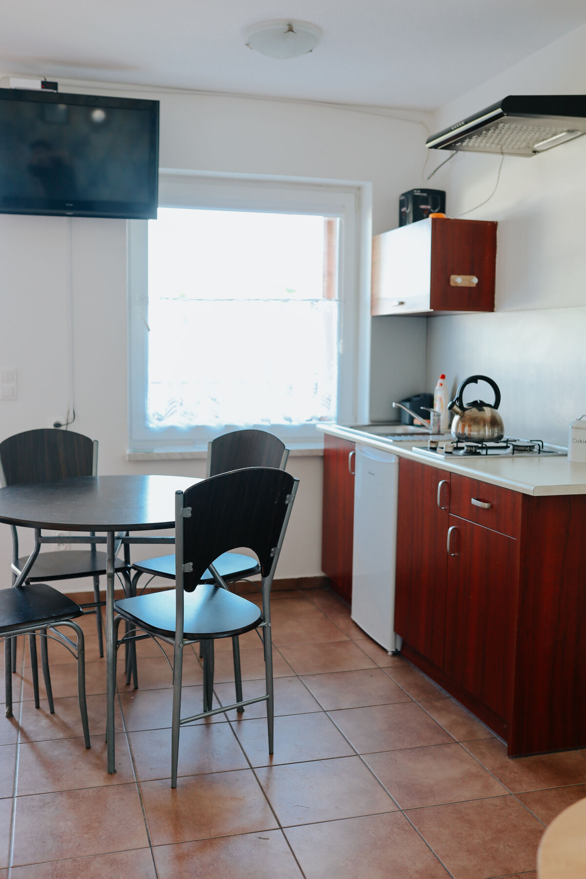 • aneks kuchenny(lodówka,kuchenka gazowa,zlewozmywak,stół,krzesła,komplet naczyń,sztućców,garnków,ława kawowa)
