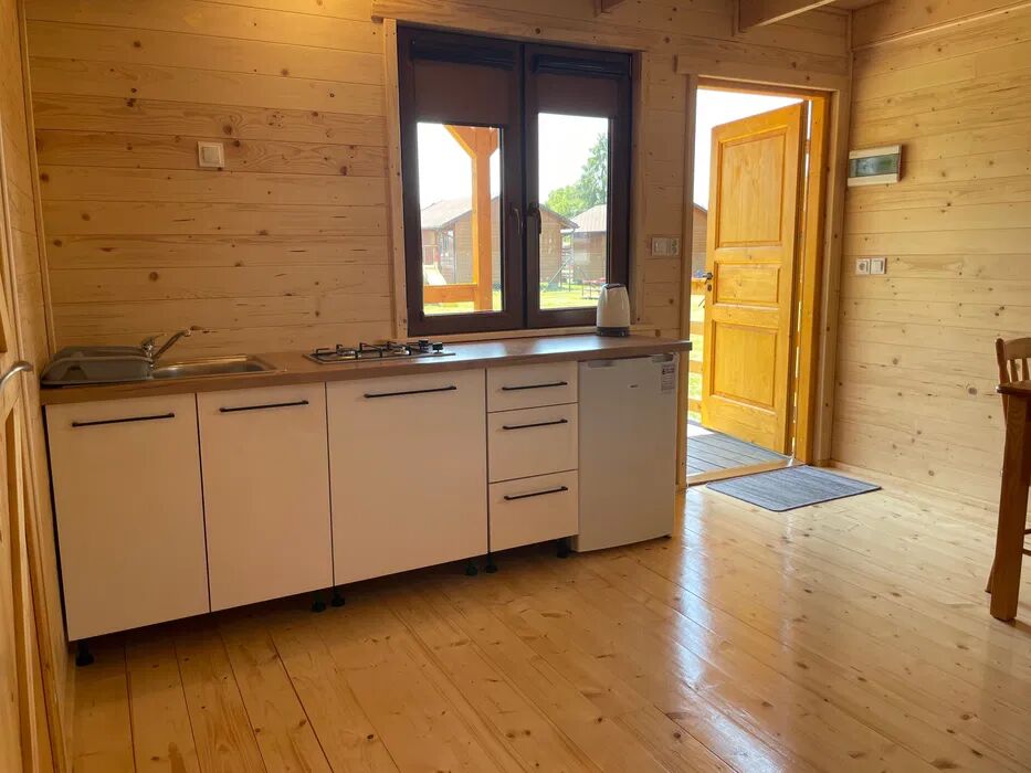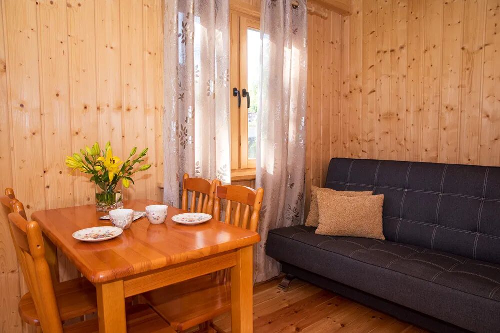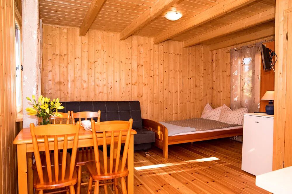 Do Państwa dyspozycji oddajemy komfortowe drewniane domki letniskowe 4-osobowe wyposażone w: