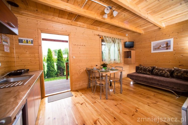 DOMKI całoroczne dla 2- 8 osób z ogrzewaniem 100m od PLAŻY - salon z aneksem kuchennym, sypialnia, łazienka, duży taras, lub 2 sypialnie, salon z aneksem, łazienka, balkon i taras.