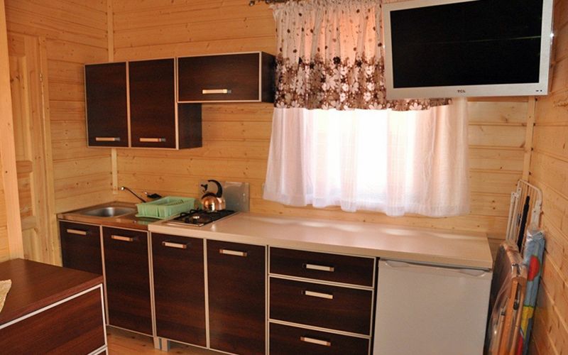 Aneks kuchenny - lodówka z zamrażalnikiem, płyta gazowa 2-palnikowa, zlewozmywak, duży komplet szafek kuchennych, czajnik elektryczny, akcesoria kuchenne (garnki, patelnie, talerze, szklanki, sztućce itp.)
