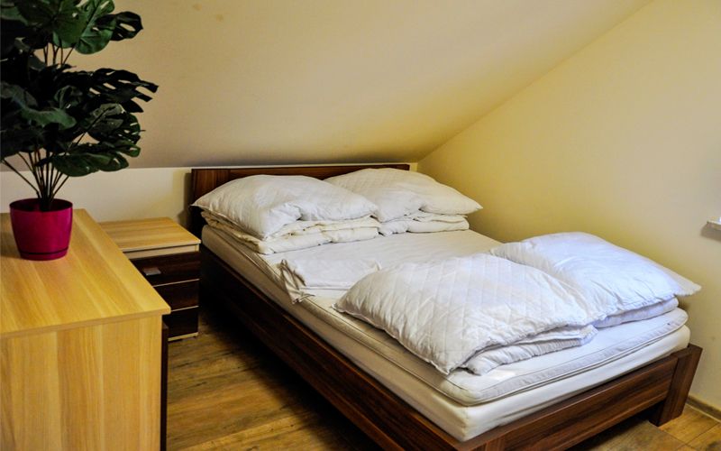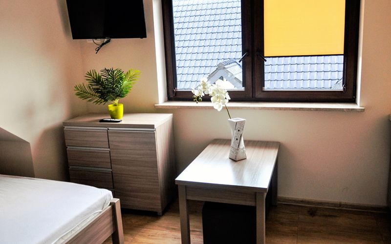Pokój - łózko hotelowe + rozkładana kanapa, szafa , ława + 2 pufy, tv, wi-fi, pościel, koce.
