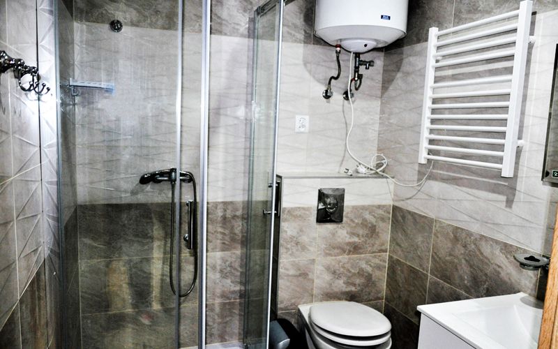 Łazienka - z oknem, w całości wyłożona glazurą, kabina prysznicowa 90 cm, WC, umywalka z szafką, stacjonarna suszarka do włosów, suszarka ubraniowa przenośna.