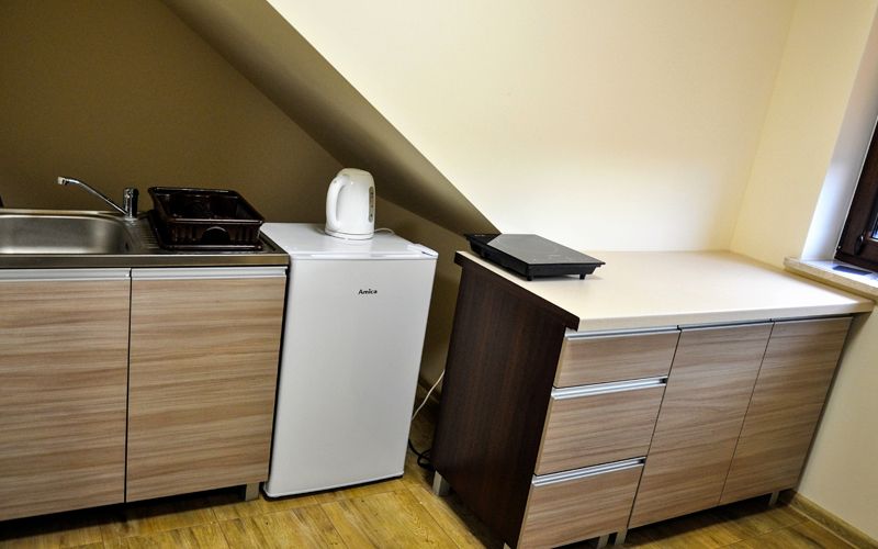 Aneks kuchenny - duża lodówka z zamrażalnikiem, płyta ceramiczna 2- palnikowa, zlewozmywak, duży komplet szafek kuchennych, czajnik elektryczny, akcesoria kuchenne (garnki, patelnie, talerze, szklanki, sztućce itp.)