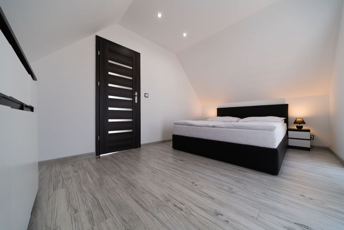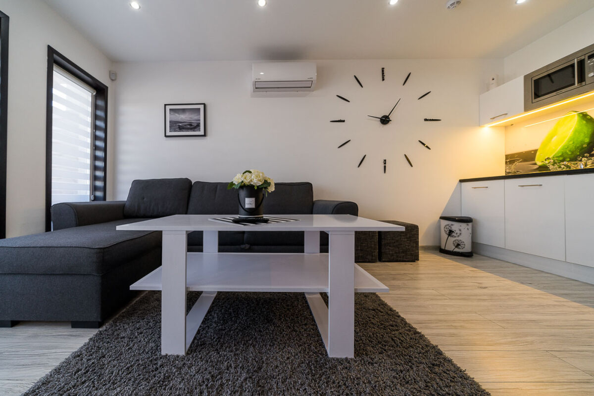 Domki mają po 55 m2 każdy, składają się z dwóch sypialni dwuosobowych na piętrze, z czego jedna wyposażona jest w podwójne łóżko, natomiast druga w dwa łóżka pojedyncze. Na parterze domku salon wyposażony w narożnik (z funkcją spania – dwuosobowy), aneks kuchenny, łazienka z pełnym węzłem sanitarnym. Na każdym z tarasów czeka na Państwa komplet wypoczynkowy oraz huśtawka – kosz bujany, który pozwoli na chwilę odpoczynku i relaksu