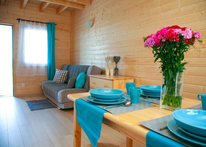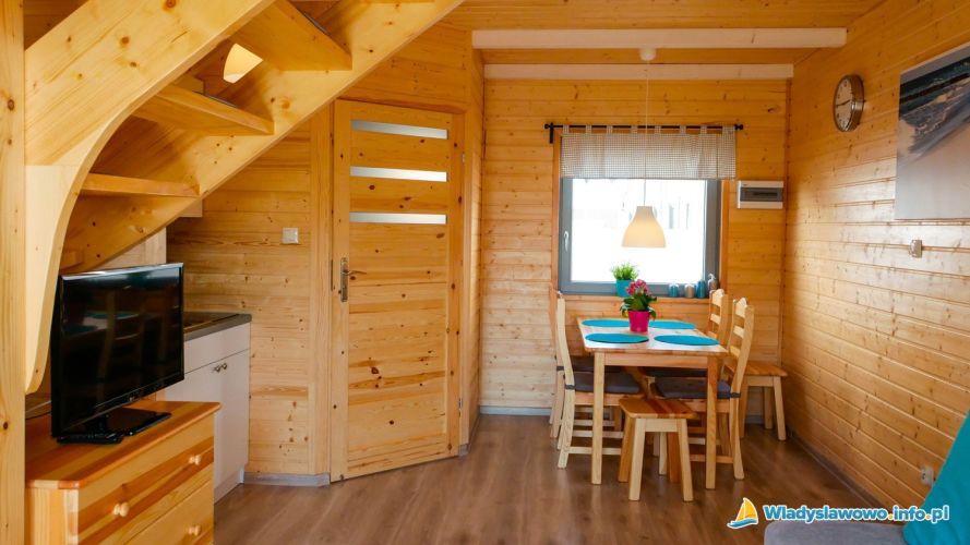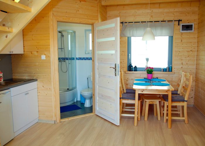 Parter domku składa się z pokoju dziennego z jadalnią i kącikiem wypoczynkowym (kanapa z funkcją spania dla dwóch osób, TV, stół, krzesła, komodę) w pełni wyposażonego aneksu kuchennego (lodówka, kuchnia mikrofalowa, płyta indukcyjna, zlewozmywak, czajnik, bezprzewodowy, garnki, naczynia kuchenne)