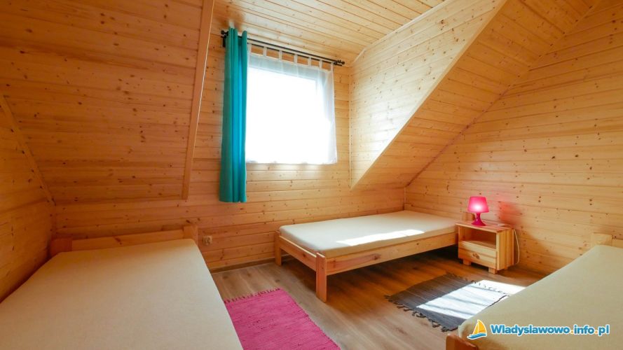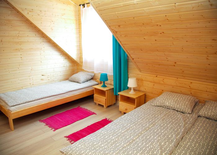 Piętro domku składa się z dwóch niezależnych sypialni: w jednej znajduje się 1 pojedyncze łóżko i 1 podwójne w drugiej znajdują się trzy pojedyncze łóżka z możliwością zestawienia łoża małżeńskiego. Sypialnie wyposażone są w pościel, nocne szafki z lampkami nocnymi, szafa z wieszakami.