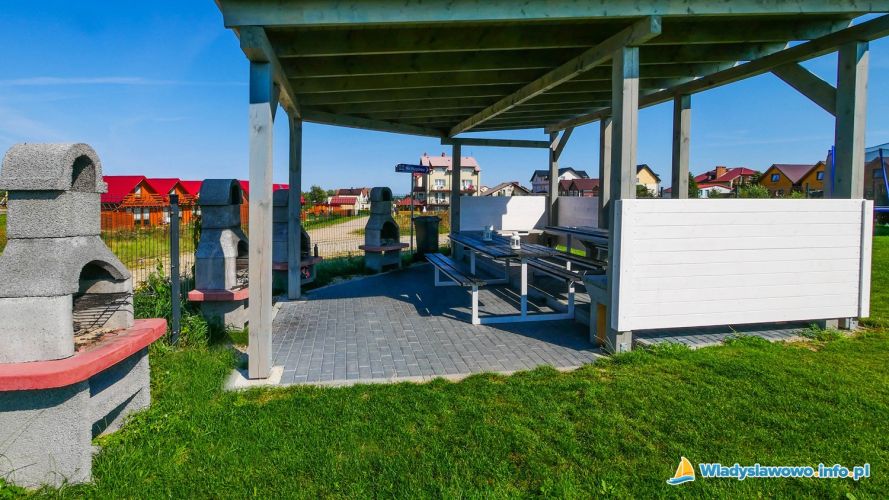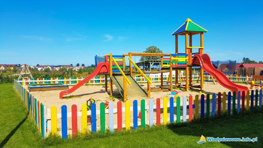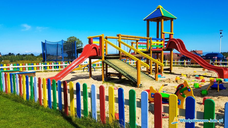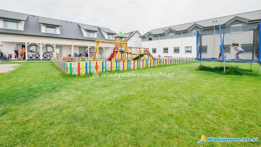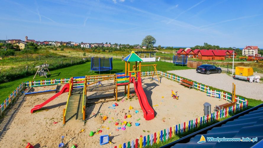 Wspaniałe domki dedykowany dla rodziców z dziećmi, wspaniały placyk zabaw dla każdego dziecka w każdym wielu, posiadają też dwie trampoliny dla trochę więkzych dzieci, duży placyk koło placu zabaw gdzie można spokojnie zagrać z dzieckiem w piłkę, lub badmintona. Na terenie są też małe samochodzik typu JEŹDZIK COZY COUPE LITTLE TIKES dla maluchów i super przystosowany do tego chodnik w okołu domków gdzie dzieci spokojnie na tych samochodzikach mogą jeździć.Obiekt wyposażony jest w basen z podgrzewana wodą, w których również maluch mogą spokojnie popływać.Teren jest ogrodzony,posiada miejsca parkingowe.Dodatkowym atutem tego miejsca jest to że w obiekt posiada własny meleks który dowozi swoich gości na plaże powrotem. Obiekt organizuje w trakcie trwania turnusów również dla małych gości atrakcje w postaci , pokazów cyrkowych,iluzji czy animacji. Na terenie znajduje się również altanka w której można rozpalić grilla