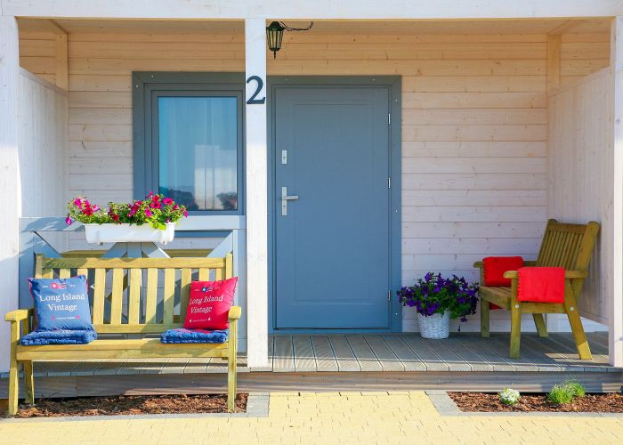 Sypialni (łóżko podwójne, lampka nocna, szafa na ubrania). Każdy domek apartamentowy ma swój taras z meblami ogrodowymi.