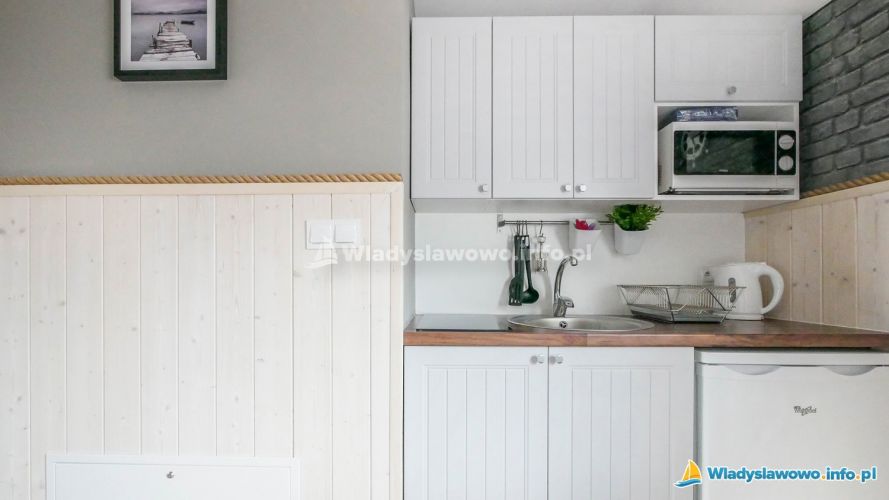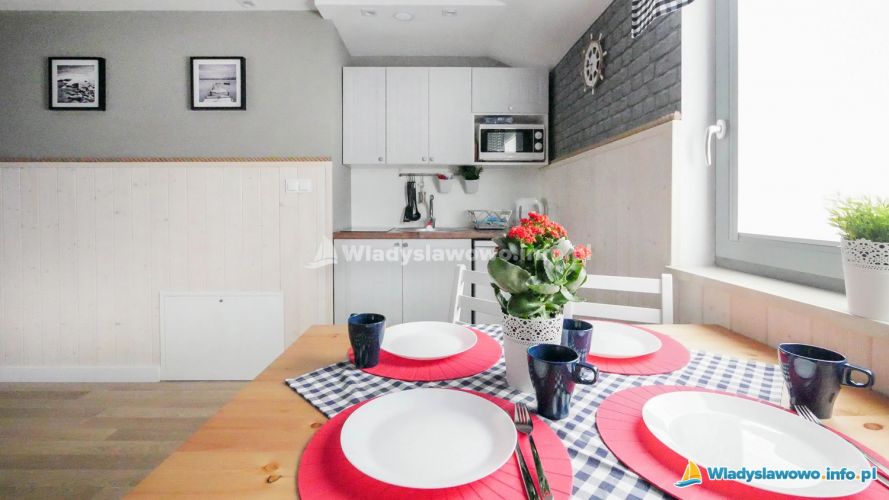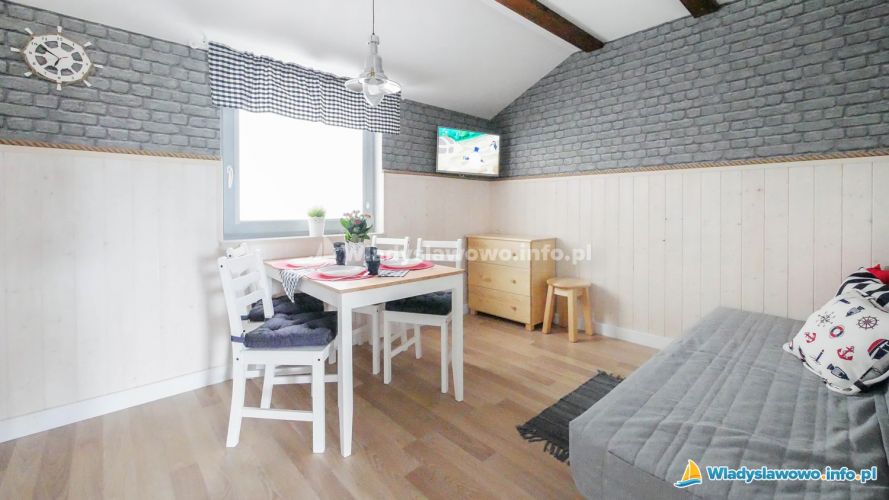 Pokoju dziennego z jadalnią (kanapa z funkcją spania dla dwóch osób, TV, stół ,krzesła, komoda) w pełni wyposażonego aneksu kuchennego (lodówka, kuchnia mikrofalowa, płyta indukcyjna, zlewozmywak, czajnik bezprzewodowy, garnki, naczynia kuchenne)